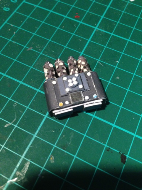 La technique utilise pour la tete est interessante je pense, j'ai d'abord fait un cylindre plein de papier enroule et coller autour d'un cure dent. J'ai mis le cure dent dans mon dremmel je me suis ensuite servi de celui-ci comme un tour et j'ai utilise une lime pour arrondir le dessus de la tete. J'ai ensuite coller des morceaux de papier (bande sur la tete, disque sur les oreilles, contour des orbites...) pour donner du relief qui est ensuite améliore par la peinture. C'est la premiere fois que j'utilise cette technique et j'en suis tres satisfait.