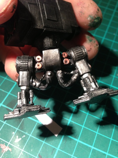 Tout d'abord le sous ensemble des jambes La majorite du squelette est peint pour donner une impression de metal noir (brossage a sec argente sur une sous couche noire puis lavis en ton fonces). Les tuyaux entre les jambes sont en noir matte, les pistons en metal argentes et des accents cuivre un peu partout parce que c'est joli