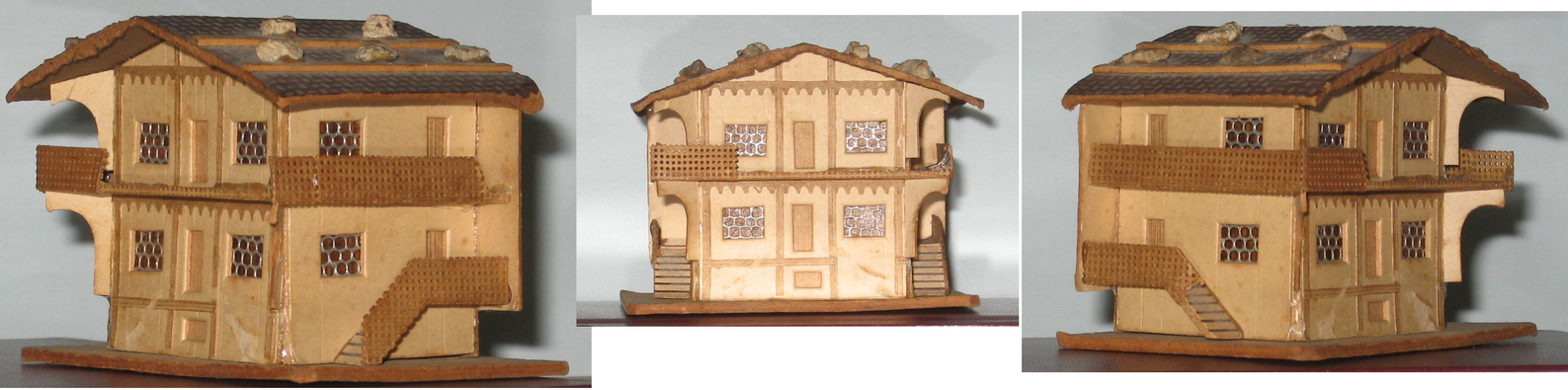 Bon, le renfort est cintré du fait de sa siccité, de son ancienneté, mais se sont 4 faces, collées sur un ruban fermé de papier. Les murs sont solidarisés de la même façon. Les fenêtres "grillagées" (collées à l'intérieur) ouvrent sur la belle face du carton interne, et les portes sont réalisées par ajout d'une épaisseur sur la face interne. Et là aussi cette épaisseur est rainurée sur le côté visible !