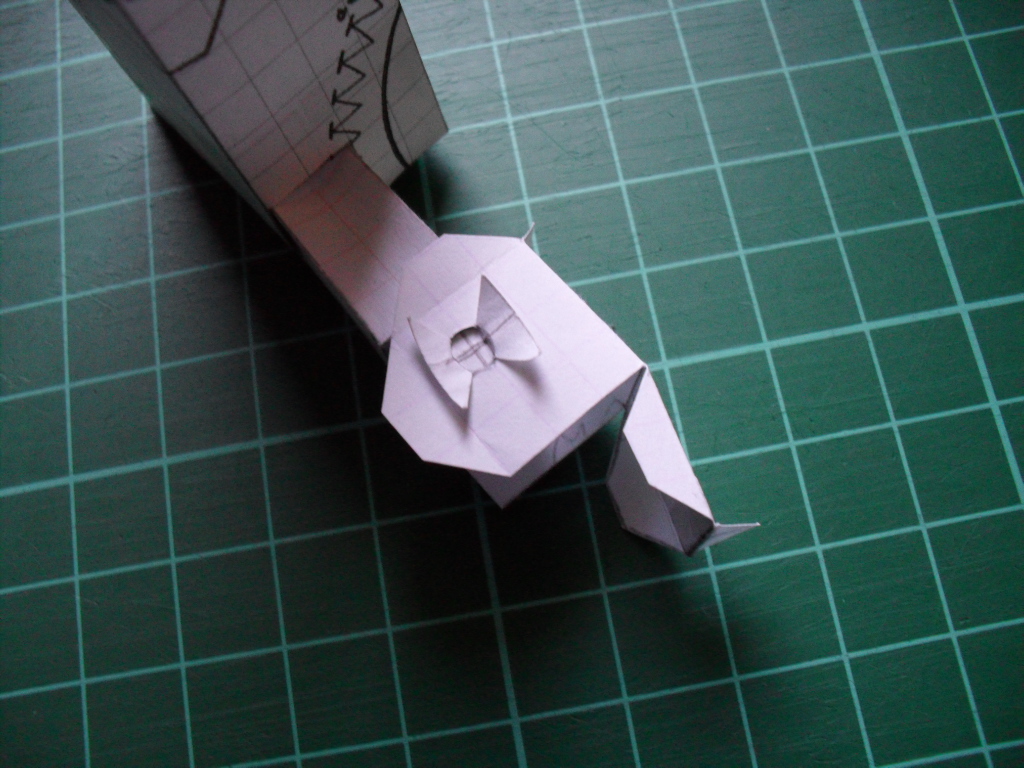 La fin du cou. Là je le rembourre de papier pour le rendre plus solide.La tête (oui elle est grosse).Et la pièce qui fera coulisser le cou.