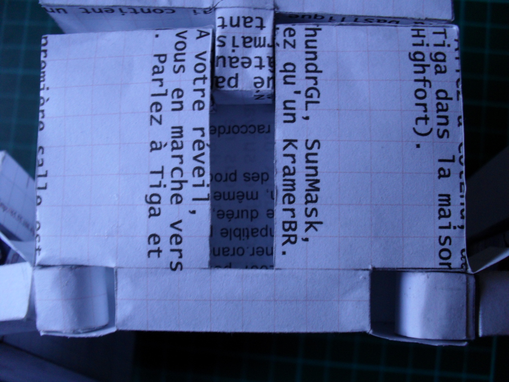 Bonjour tout le monde. pour ceux qui s'en rappelle j'avais fais il y a quelque temps une maquette de transformers originale avec des chute de papier voir ici. Aujourd'hui je fait encore un transformers, mais cette fois contrairement au précédent, je vais utilisé un vrai jouet transformers comme modèle que je vais adapter en papercraft, et en plus j'ai prévue de le rendre disponible en reproduisant les pièces que j'ai faite, à l'aide photoshop (et en plus il pourra rouler). Pour commencer voici le modèle originale. Non vous ne rêvez pas, il n'as pas de roue (je l'avais acheté dans une brocante pour 1 franc (oui franc et pas euro)).Les avant bras Les articulation des coudes (sur le jouet c'est une pièce maintenue par deux ressort donc j'ai du m'adapter)Les avant bras et les coudes attaché.