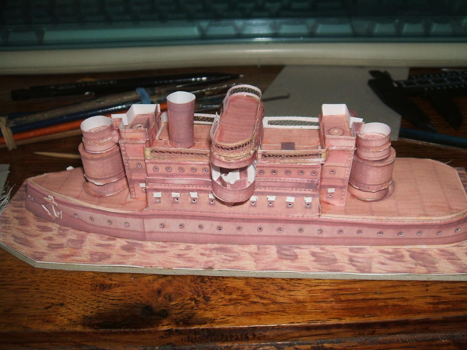 Les rambardes en diagonale sont tirées de l'enveloppe d'une dragée. voici le cuirassé avec ses rambardes la suite dans le message suivant.