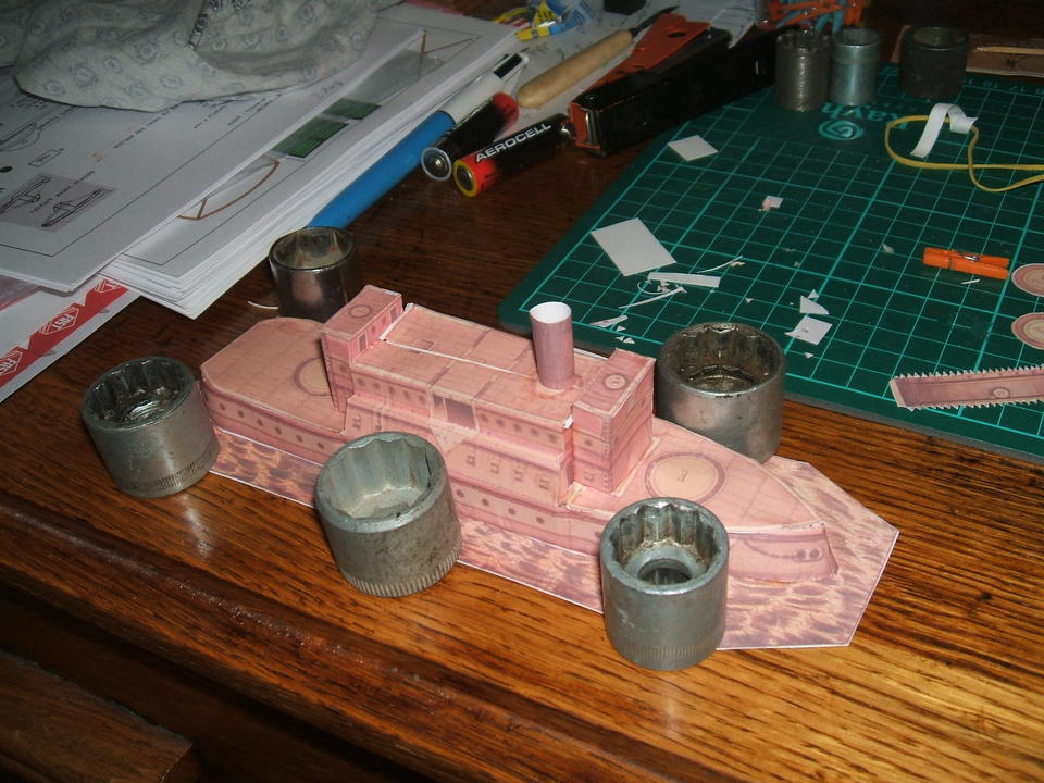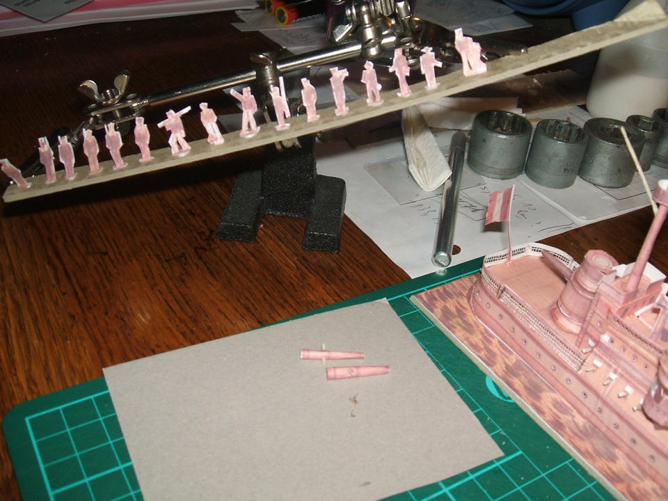 Les rambardes en diagonale sont tirées de l'enveloppe d'une dragée. voici le cuirassé avec ses rambardes la suite dans le message suivant.