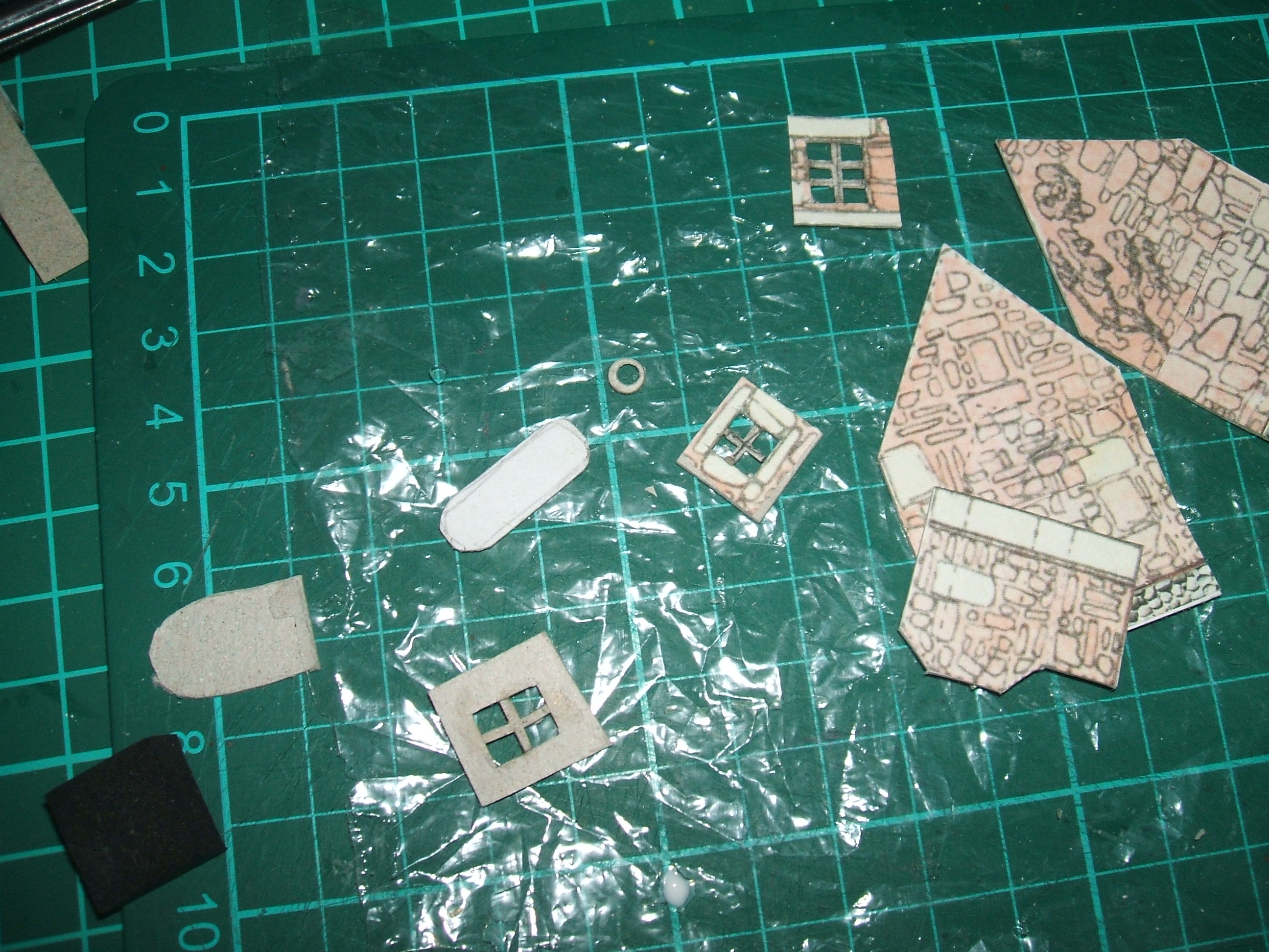 Les toits recouverts de tuiles, les murs rehaussés garnis de galets, le percement des ouvertures , la suppression des dessins des objets rapportés et le collage des languettes de liaison entre les pans de murs. Je rappelle qu'il est plus facile de coller droit les murs comme ça qu'en les pliant, avec un carton épais. On rattrape mieux les problèmes d'équerrage. En haut à gauche, le bassin sèche sous presse tandis qu'à droite on voit la niche et la gamelle. Au milieu à gauche, les volets rustiques. Voyez aussi à gauche le bouchon applicateur du bidon de colle. Je ne m'en sers plus jamais. J'utilise des pinceaux, plus ou moins gros selon la taille du collage. Ne prenez pas des pinceaux en martre kolinski mais des pinceaux premier prix pour bambins. Donnez vos pinceaux en martre à des artistes nécessiteux.