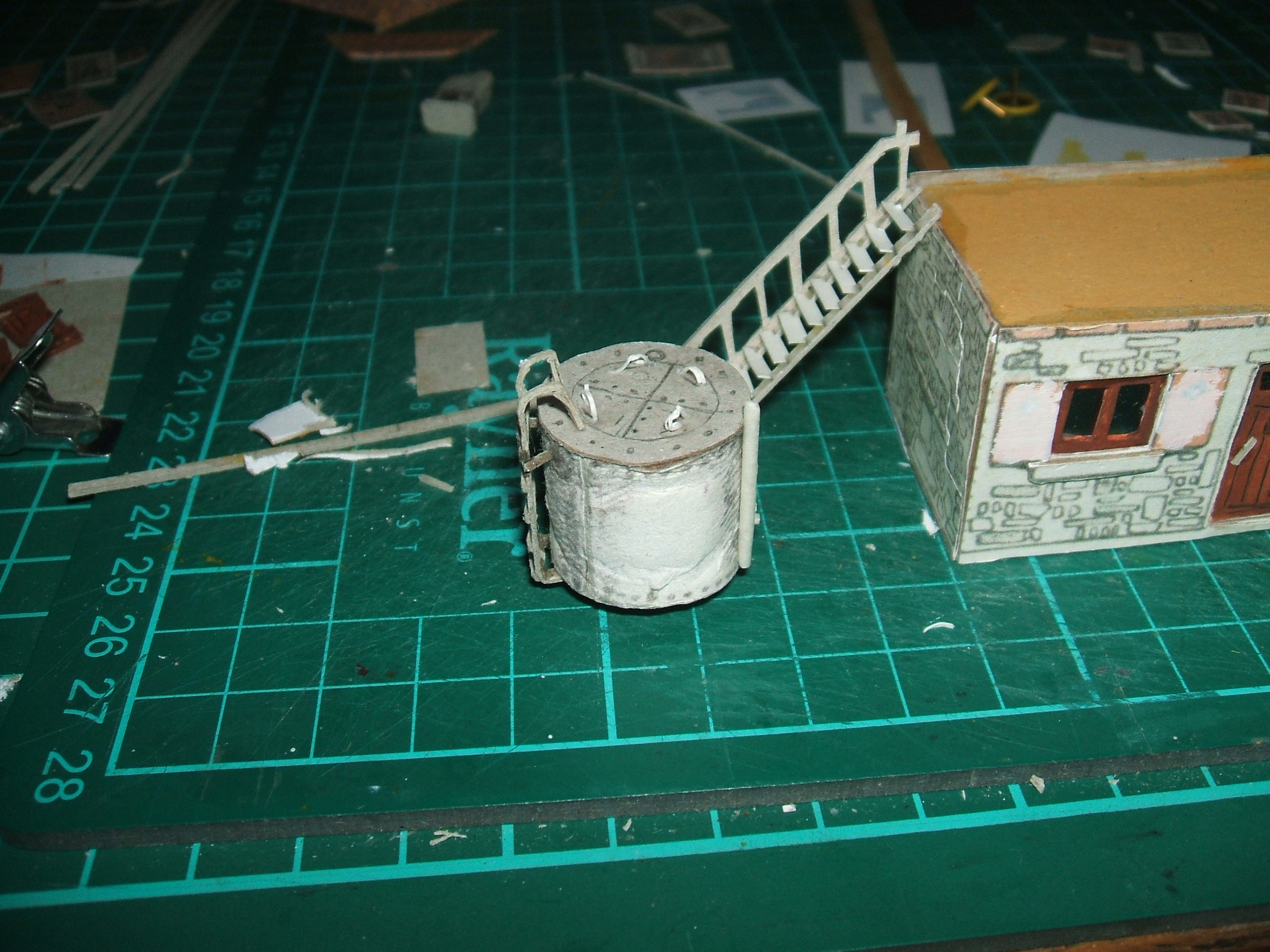 L'escalier fini avec sa rampe, encore fixé sur sa planche Il faut en faire le plus possible dans ces conditions, c'est facile à manipuler, pas fragile, pas de risque de déformation ou de montage qui reste collé aux doigts. On peut même faire l'essentiel de la peinture . Quand on a fini tout ce qu'on pouvait, on prend son réglet métallique et son cutter bien aiguisé, on coupe bien ras et on détache délicatement le montage de son support La cuve avec son échelle d'accès. Les trappes sont simplement tracées au crayon; montage cyanoacrylate liquide. On coupera après ce qui dépasse trop Voilà l'échelle en place; à droite les volets sont peints et derrière les huisseries posées sur les chiens assis La cuve s'équipe (poignées, niveau d'eau, robinet (caché par le niveau)), l'escalier derrière a belle allure et les huisseries se montent sur la maison Les chiens assis reçoivent leurs bouts de toits à suivre