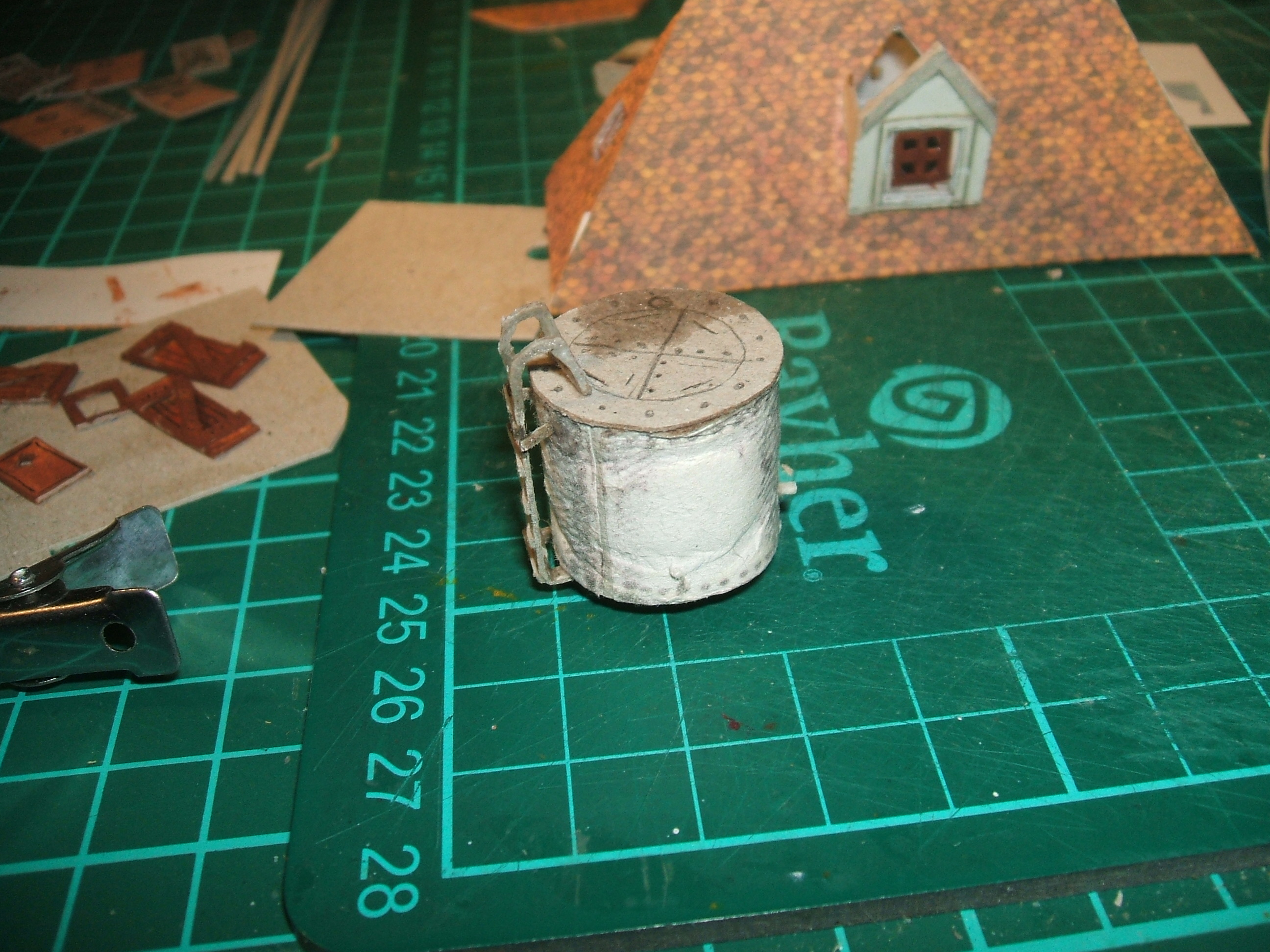 Présentation des divers accessoires internes. En arrière plan, on voit que le toit a reçu ses tuiles canal. La place est comptée les supports de l'abri de porte sont posés décoration des accessoires noter la cuve que je trouve très réussie. Il y a une petite commode dont je n'ai pas parlé, mais ce ne sont que deux bouts de carton. J'utilise souvent le dessin au crayon peint ensuite à la peinture à l'eau pour faire les détails simples. Le crayon protège et écrase un peu le carton qui boit moins la peinture à l'eau à cet endroit? Ça donne un peu de relief pour pas cher et peu d'effort. tous ces objets sont tracés à main levée au gré de l'inspiration du moment et souvent je n'ai pas de dessin à vous proposer. En regardant bien les pièces brutes on voit les principes et je pense que ce doit être facile à imiter. Dans la prochaine, j'ai quand même tracé la brouette. à suivre