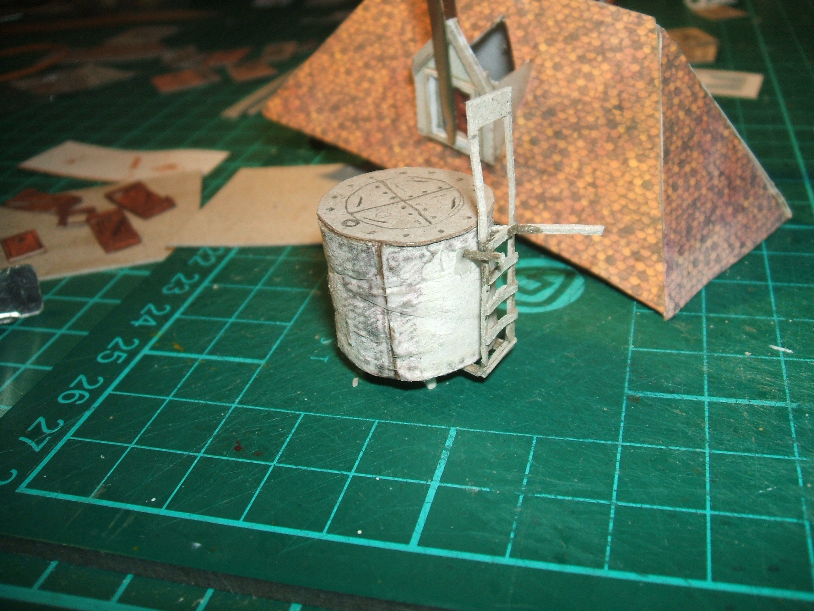L'escalier fini avec sa rampe, encore fixé sur sa planche Il faut en faire le plus possible dans ces conditions, c'est facile à manipuler, pas fragile, pas de risque de déformation ou de montage qui reste collé aux doigts. On peut même faire l'essentiel de la peinture . Quand on a fini tout ce qu'on pouvait, on prend son réglet métallique et son cutter bien aiguisé, on coupe bien ras et on détache délicatement le montage de son support La cuve avec son échelle d'accès. Les trappes sont simplement tracées au crayon; montage cyanoacrylate liquide. On coupera après ce qui dépasse trop Voilà l'échelle en place; à droite les volets sont peints et derrière les huisseries posées sur les chiens assis La cuve s'équipe (poignées, niveau d'eau, robinet (caché par le niveau)), l'escalier derrière a belle allure et les huisseries se montent sur la maison Les chiens assis reçoivent leurs bouts de toits à suivre