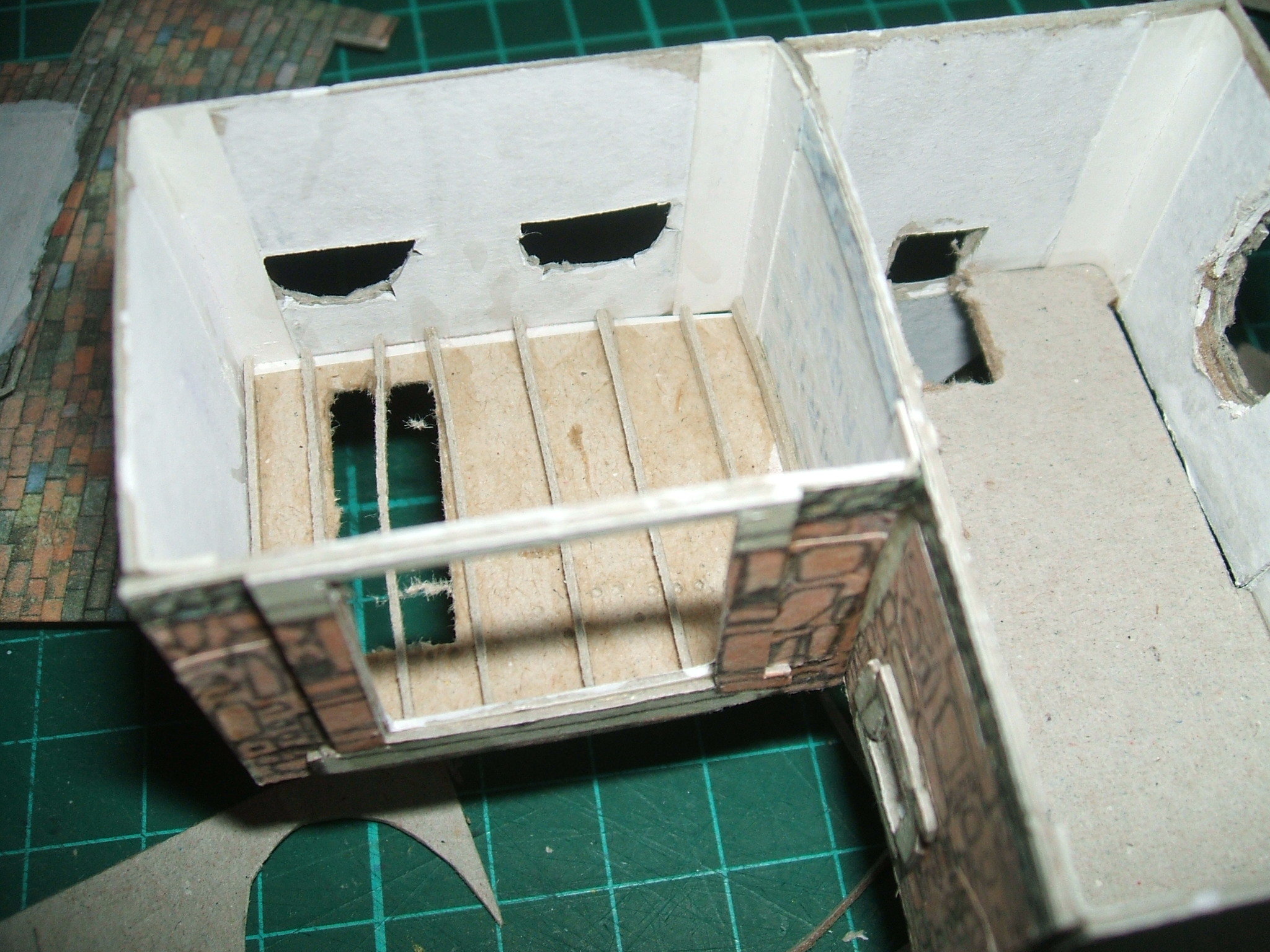 L'autre face des toilettes en cours d'édification. Noter les tuiles abîmées, de récupération, évidement pour cette annexe Les plafonds dont celui de l'écurie. La poutre passant dans le trou sera enlevée après séchage. Ce trou sert à faire tomber le foin dans la mangeoire et monter avec une échelle Une trappe le bouche en partie quand on reconstitue les réserves de foin. J'ai d'ailleurs creusé une fenêtre supplémentaire dans le pignon correspondant. montage de l'échelle (sous presse ) et de l'escalier de meunier (en cours) Les accessoires en cours de découpage, montage ou finition. Par exemple l'ameublement rustique (mais quand même un petit miroir) en bas à droite. Noter le choix délibéré du collage en bout plutôt que les languettes ou le pliage. Pour les petites pièces en carton épais, c'est idéal. Suite des accessoire; toilettes finies, niche décorée. Il y aura un anneau métallique pour la chaîne du chien. La flèche du monte charge (deux épaisseurs de carton) est en place au dessus de la nouvelle ouverture créée pour l'occasion. Il y a aussi un petit tabouret et une commode rustique surmontée de son miroir, sans doute volé dans une maison bourgeoise.. à suivre
