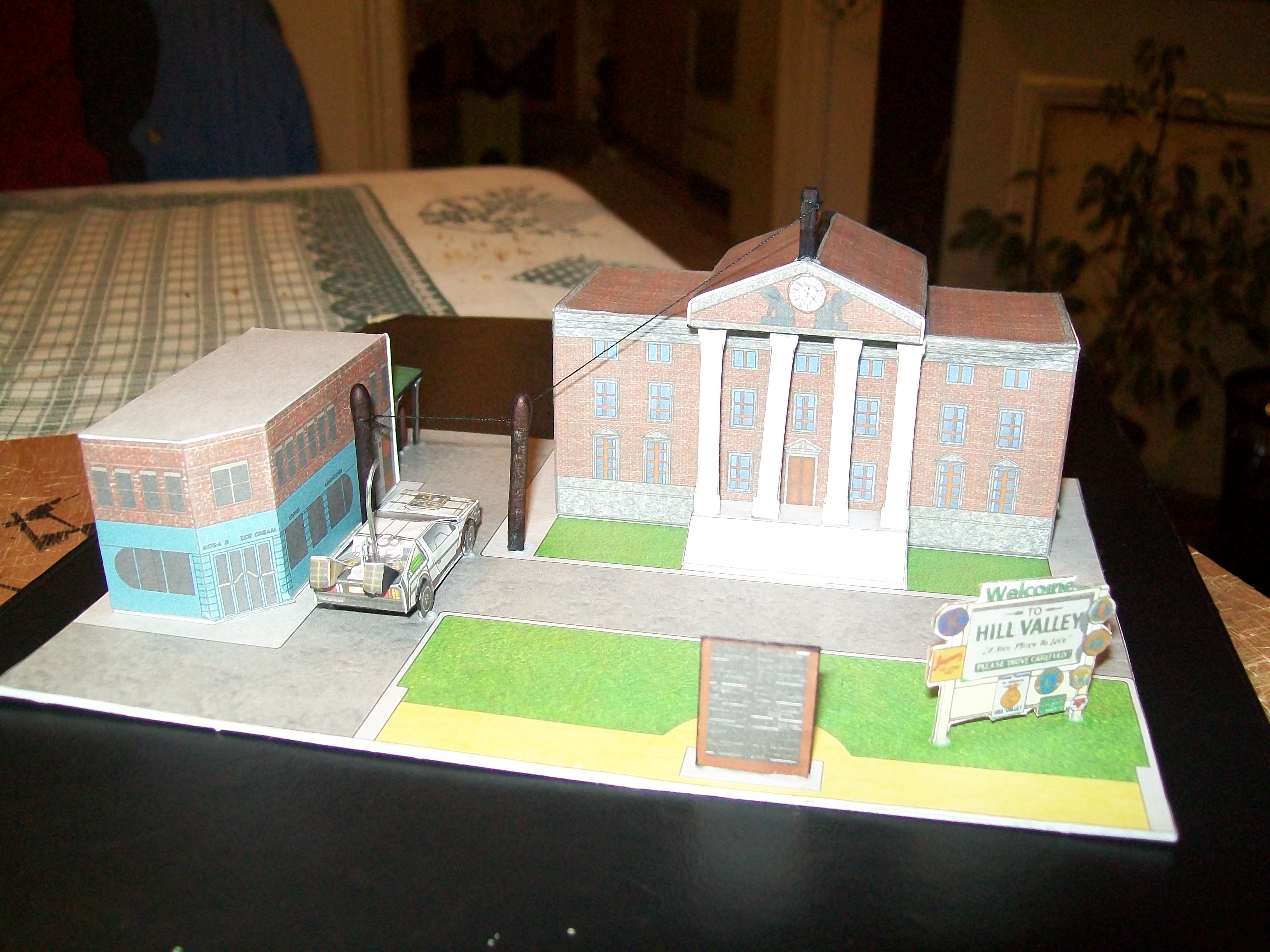 nouvelle maquette, le centre-ville de Hill Valley, avec l'hotel de ville, quelques batiments, et bien sur la DeLorean.