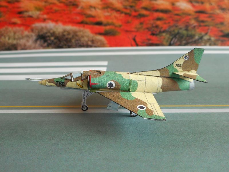J'ai fini de monter le recoloriage aux marques israéliennes du A-4 Skyhawk de Scissorsandplanes (Bruno Vanhecke). Perche de ravitaillement en vol et train d'atterrissage faits maison. La version définitive a des couleurs différentes (dans le forum "nos maquettes à télécharger").