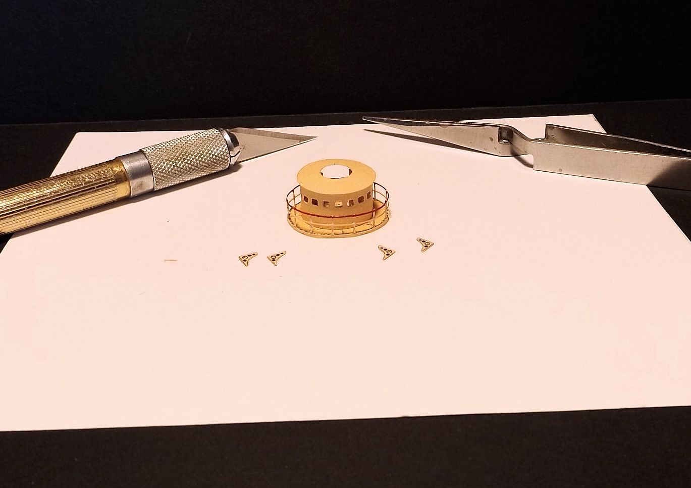 Ensuite.... j'ai attaqué quelques détails de la superstructure avant, en commençant par les canons-revolver Hotchkiss de 37 situés sur la passerelle où se trouve l'abri du timonier et à l'intérieur de celui-ci la roue du gouvernail.