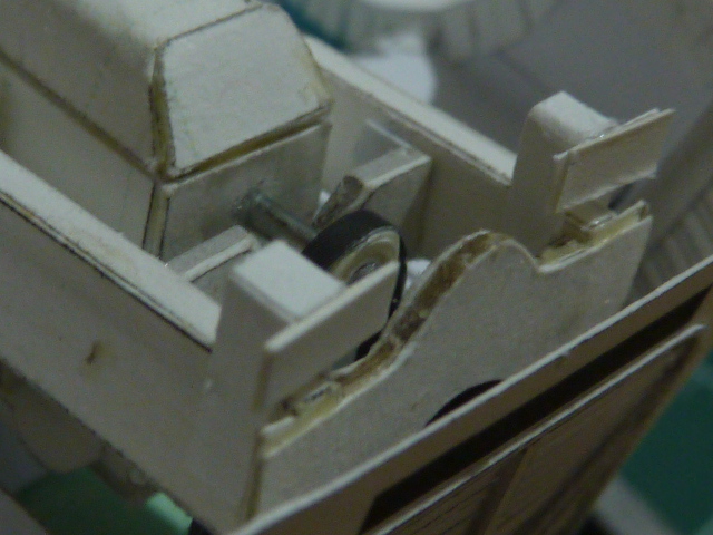 On peut placer l'essieu, puis on met les ensembles sur les bouts. On ne colle pas encore, car on doit régler la position de chacun. photo 1