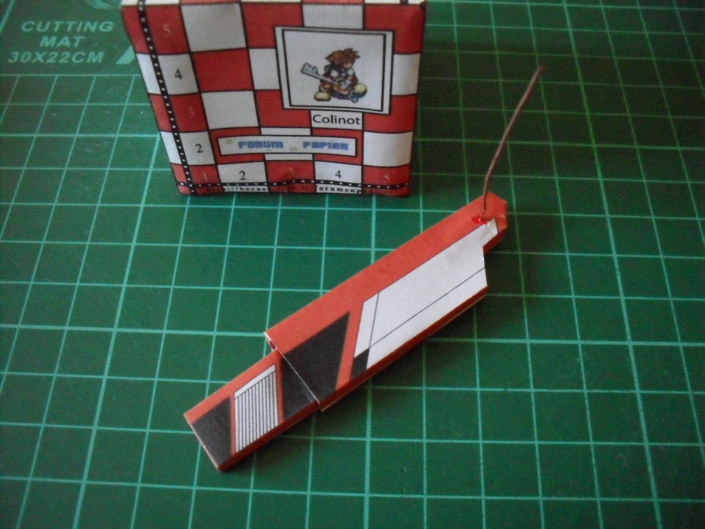 voici le train d'atterrissage, Il est articulé à l'aide d'un fil de cuivre auquel j'ai rajouté une bande de papier issue de chute que j'ai enroulé de chaque côté. le sommet de la tête. et enfin les "oreilles"