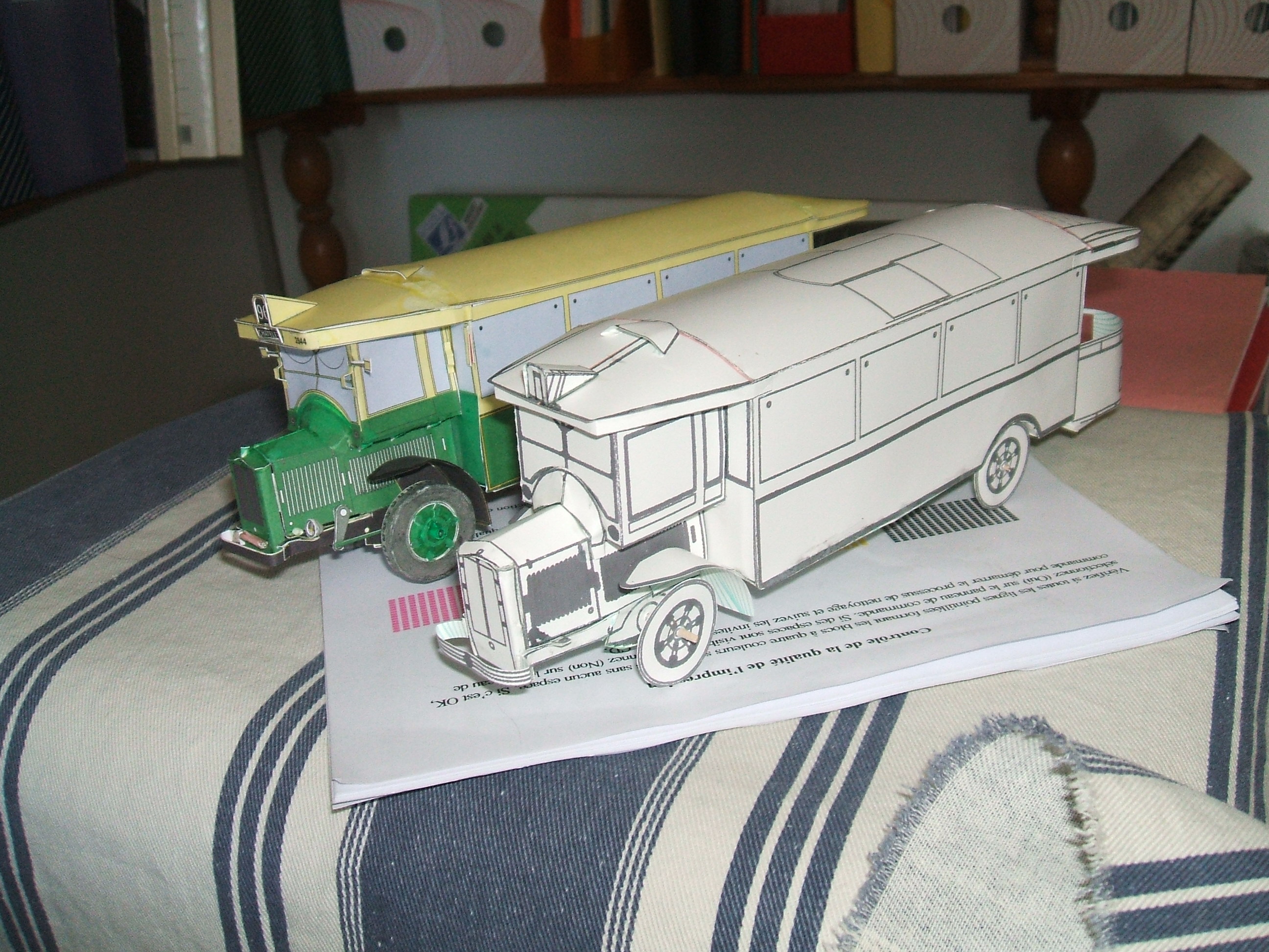 Il n'y a pas de renfort dans le deuxième modèle (en blanc) et ça allait bien. Mais sur le dernier, j'ai collé des publicités à la fin du montage et ça a un peu gondolé les côtés. Il aurait fallu les coller avant pliage de la caisse, voire sur la planche elle même. Il n'est alors pas nécessaire de renforcer si on laisse sécher la planche sous un poids culturel (atlas, livre pour les fêtes par exemple). L'avantage de rapporter les inscriptions, c'est qu'on peut personnaliser son bus. Vous voyez aussi que j'avais monté l'avant précédemment au collage de la caisse et que le toit était rapporté. Ce n'était pas uns bonne idée.