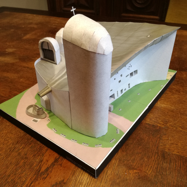 Donc noux voila à la fin. Il s'agissait d'une reproduction de la chapelle Notre Dame du Haut situé à Ronchamps, et dessiné par l'architecte Le Corbusier. Une maquette assez sympathique à faire, même si qqs petites erreurs de ma part au départ ont fait que les alignements finaux ne sont pas parfaits...