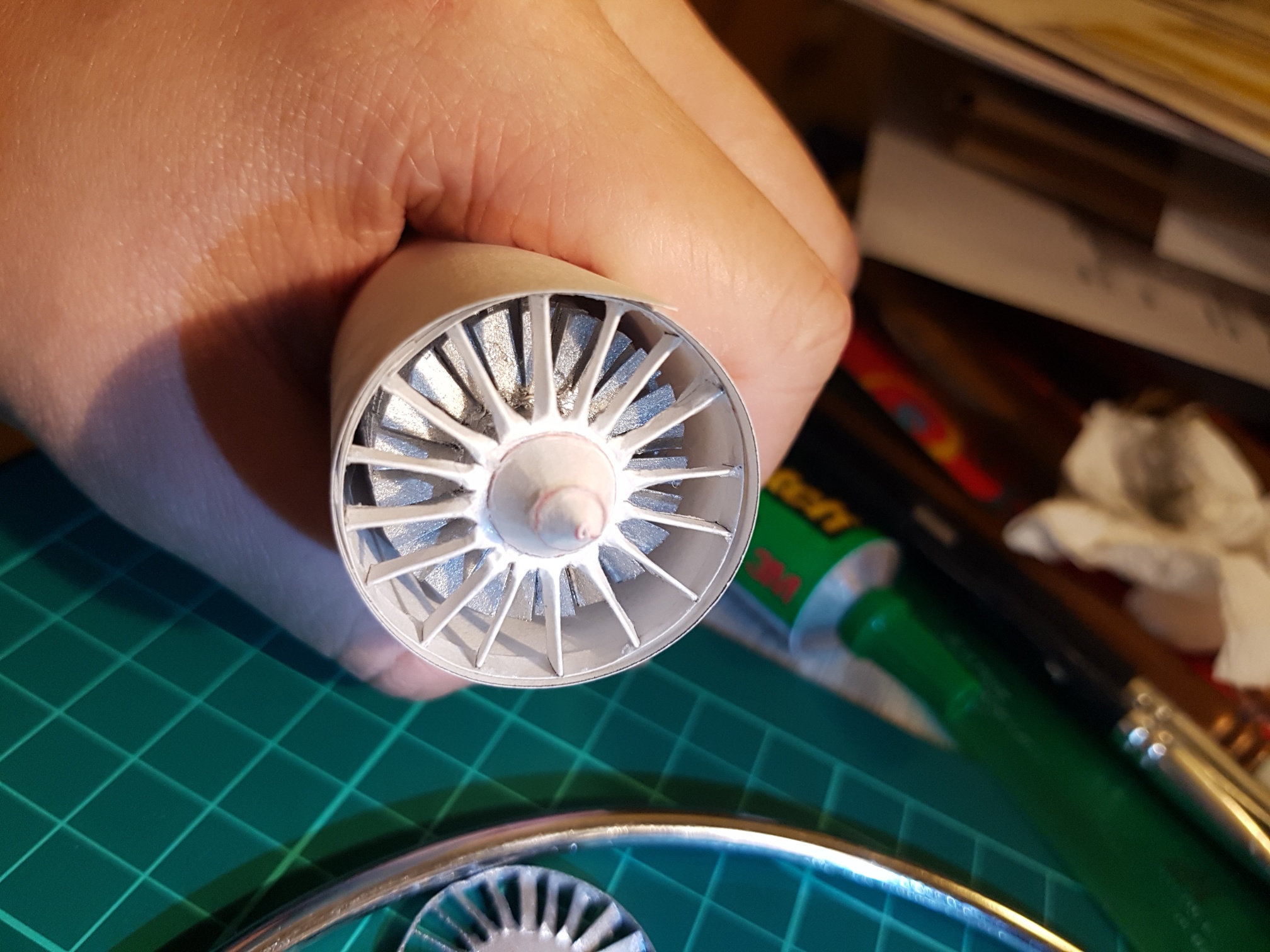 J'ai fini de peindre les pièces du turboréacteur: Maintenant il reste à dimensionner puis découper les tronçons de fixation (parties fixes liées à la nacelle). Un tronçon ira à l'avant du premier étage compresseur en jouant le rôle d'aubes de guidage d'entrée moteur (et aura la même apparence que mes turbines), visibles dans cette photo :