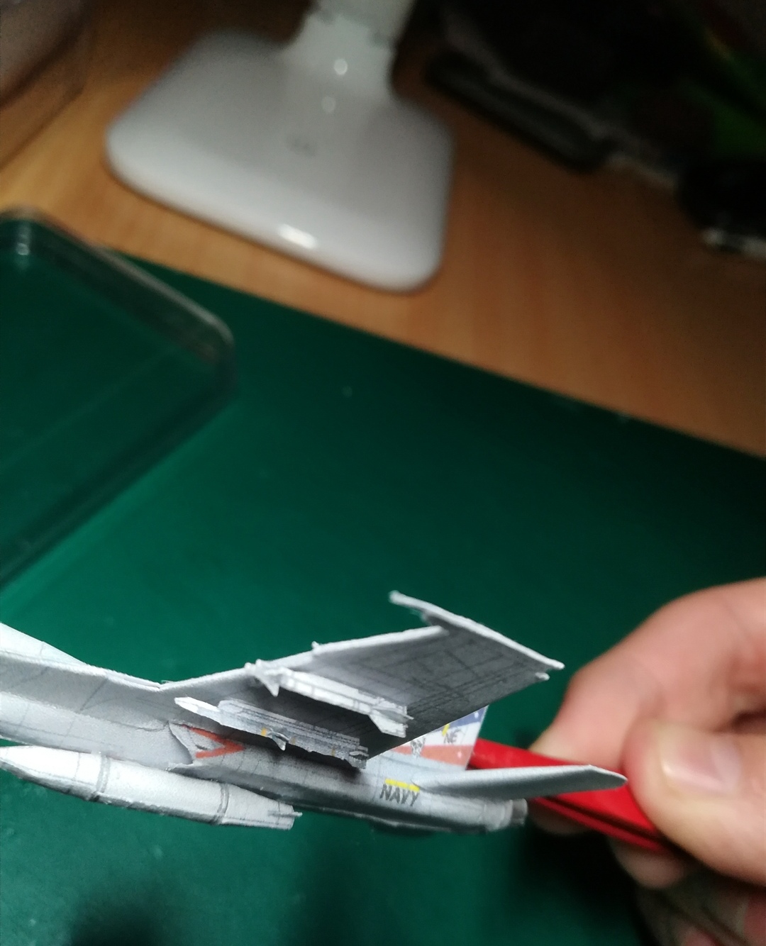 Voici quelques photos Les missiles ont été imprimés d'un autre modèle (f16 il me semble). Je les ai modifié un peu pour leur donner du reliefs et le résultats est présent (c'est du travail très petit à la pinces à épiler). Voici le rendu et le rendu final de toute la maquette