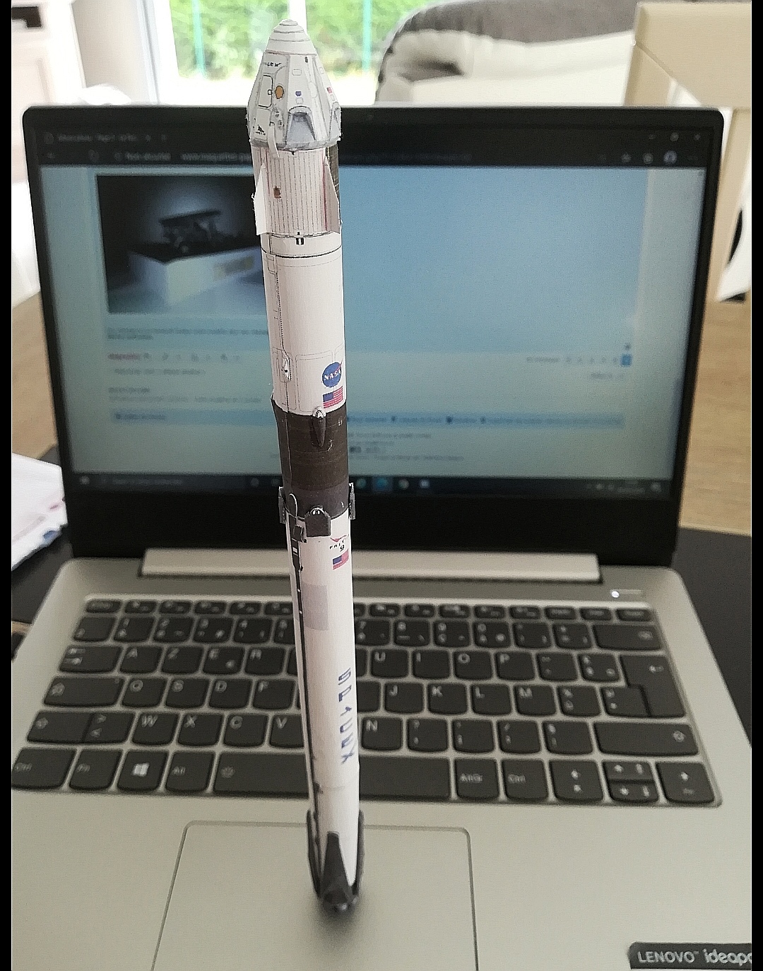 Bonjour, je complète mon album avec la fusée du vol habité qui a été lancée le 30 mai 2020. Voici la falcon 9 avec la capsule crew dragon. Elle faut 26cm (qui est déjà un beau modèle), mais je l'ai réduite sinon elle devait faire 65cm (Jan kytop l'a fait mais sans la modifier il me semble).