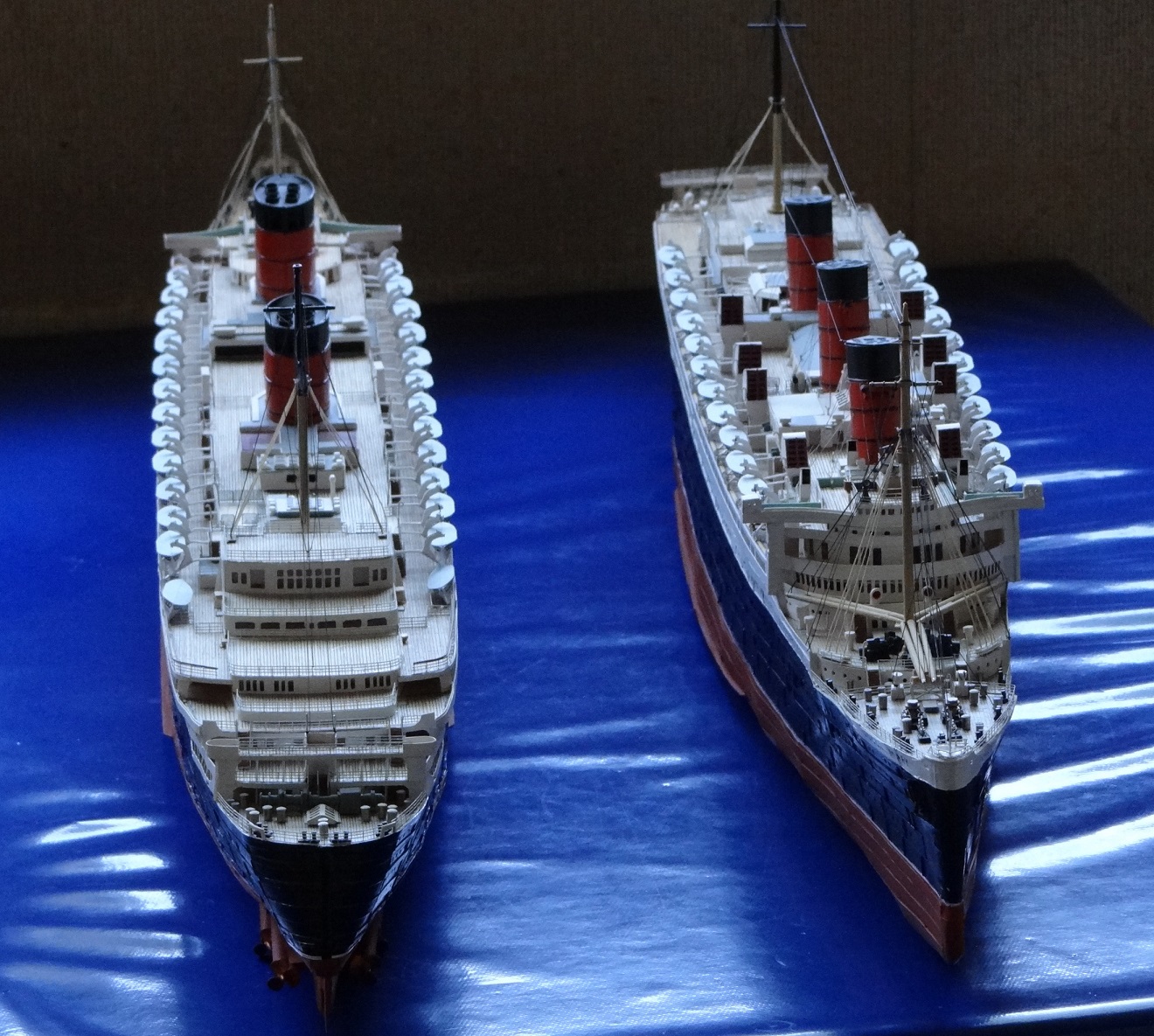 Pour commencer, les paquebots Queen Mary et Queen Elisabeth réalisés en bristol et balsa principalement et quelques photo découpes en acier pour les rembardes. Le tout au 1/400.