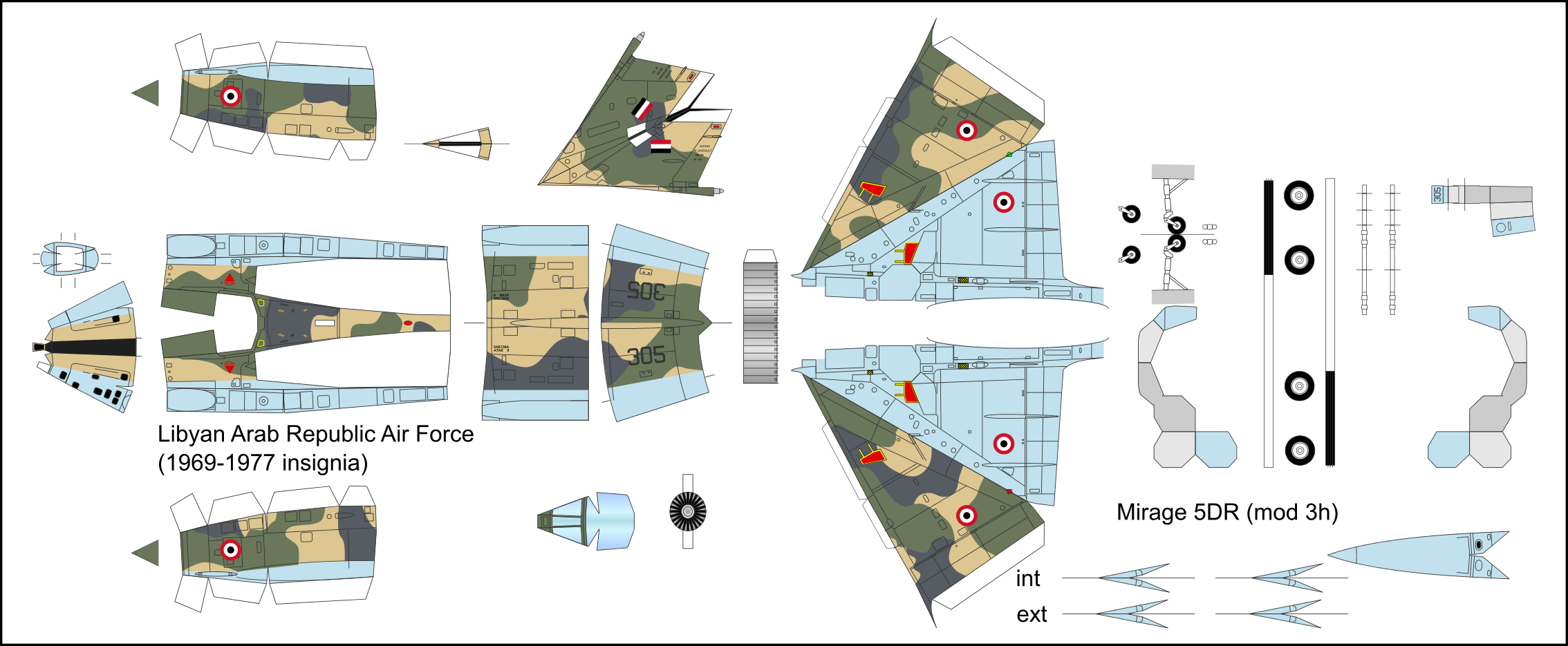 On remplace le nez du Mirage 5DE par celui du 5F ou celui du IIIRD et on obtient des Mirage 5D et 5DR libyens. Les tons verts et sable échangent aussi leur place. Le DE d'interception et le DD biplace existaient aussi dans ce camo "inversé".