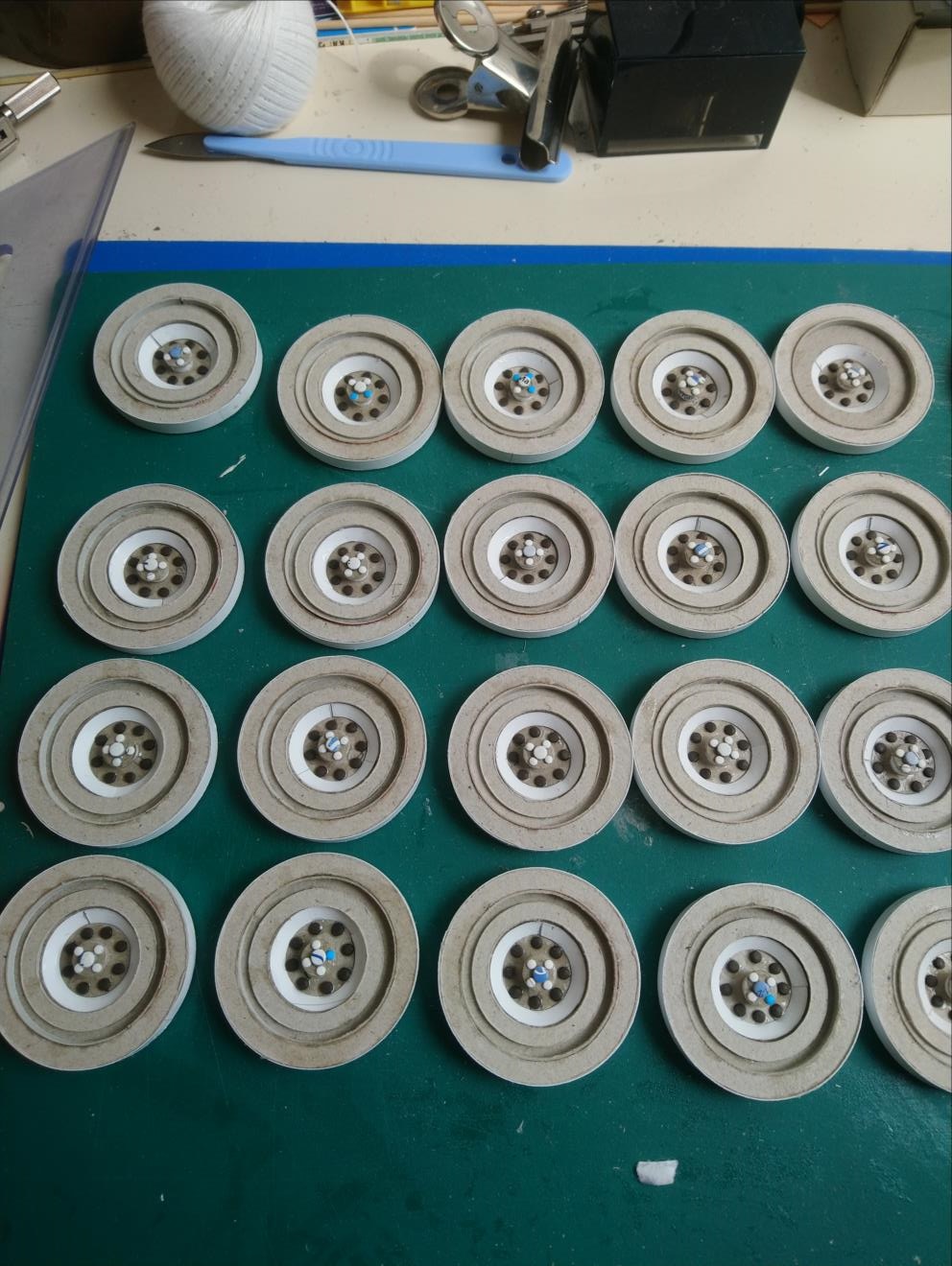 Maintenant j'attaque la découpe des quelque 200 cercles de différents diamètres qui seront nécessaires à la confection des 20 paires de roues de route.