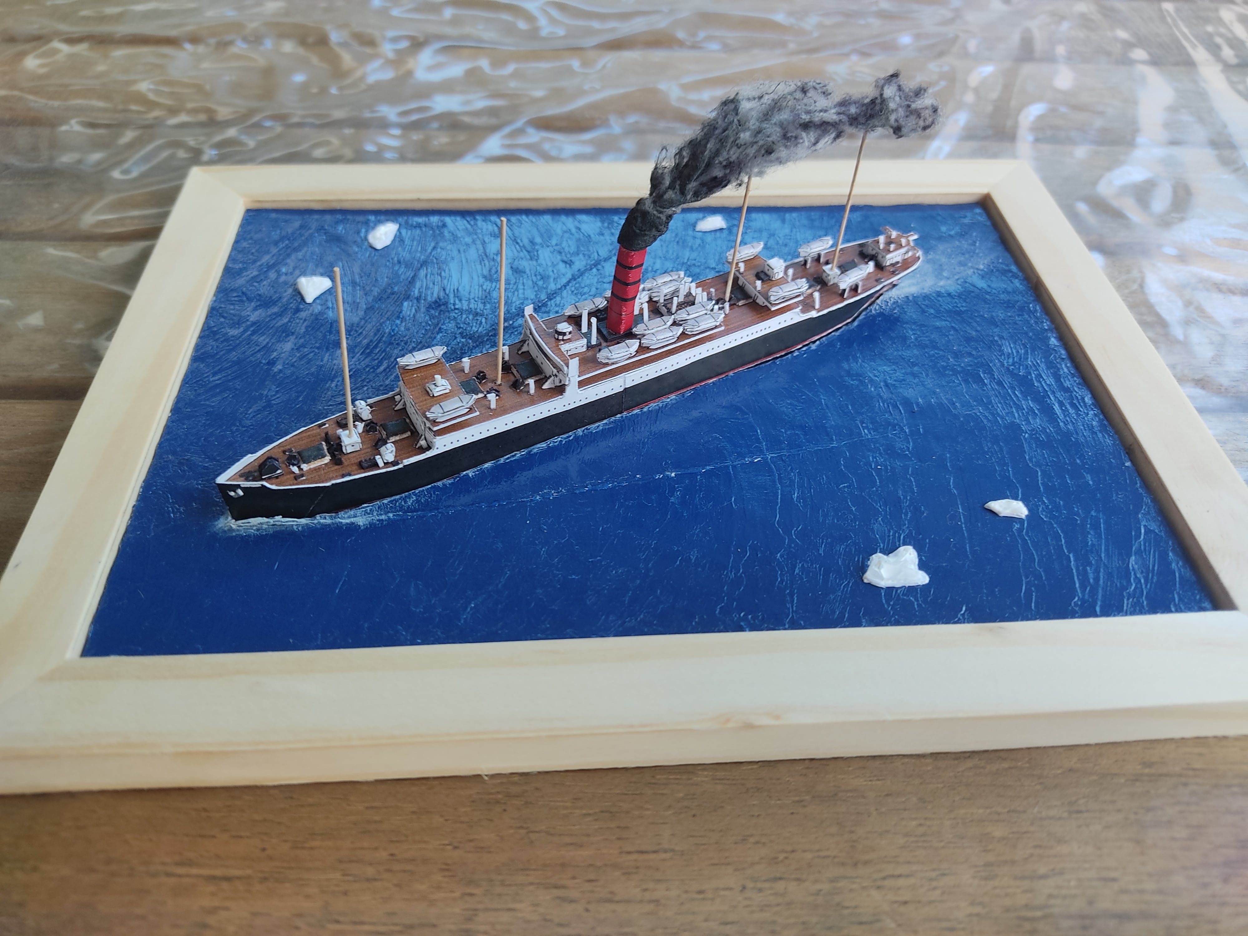 Je viens de le mettre en scène tel qu'il aurait pu être le 15 avril 1912 au petit matin, quand il marchait pleine vapeur au milieu des icebergs pour porter secours au Titanic.