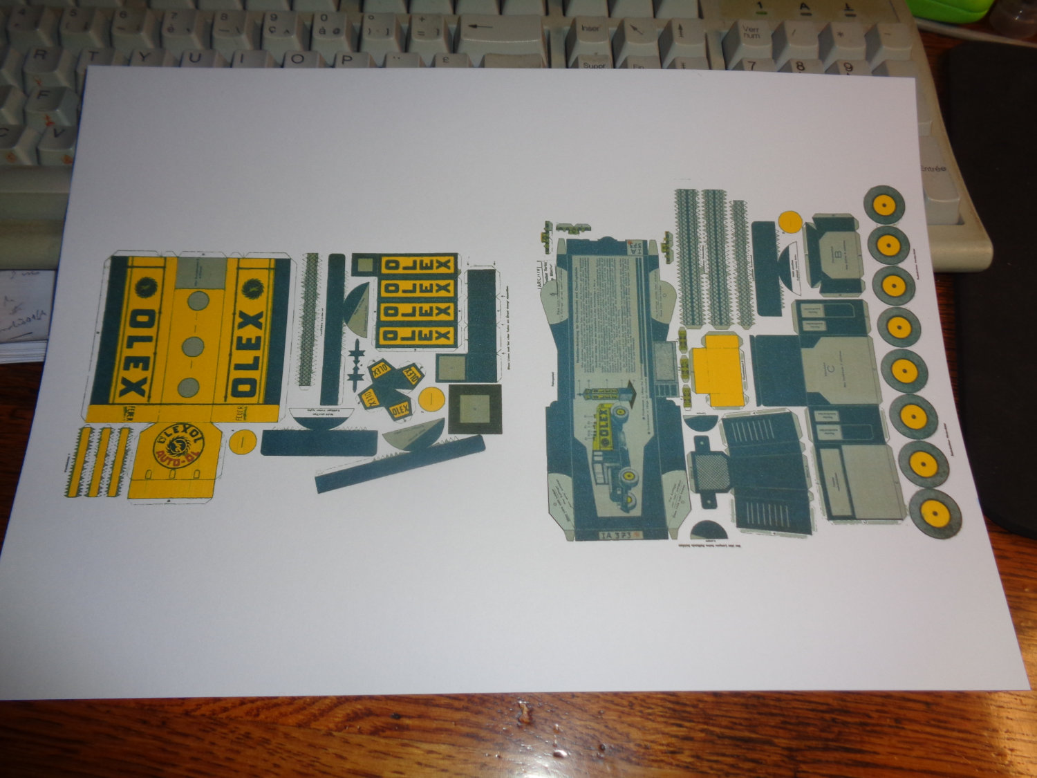 Voici les planches du camion Olex nettoyées. On voit qu'il y a beaucoup à redessiner, mais telle quelle, on peut en tirer un petit modèle. J'ai respecté les indications sur la taille de la feuille blanche et effectivement, le raccord entre la citerne et le châssis paraissent bons. Voici mon tirage sur une feuille A4 de 160 grammes.