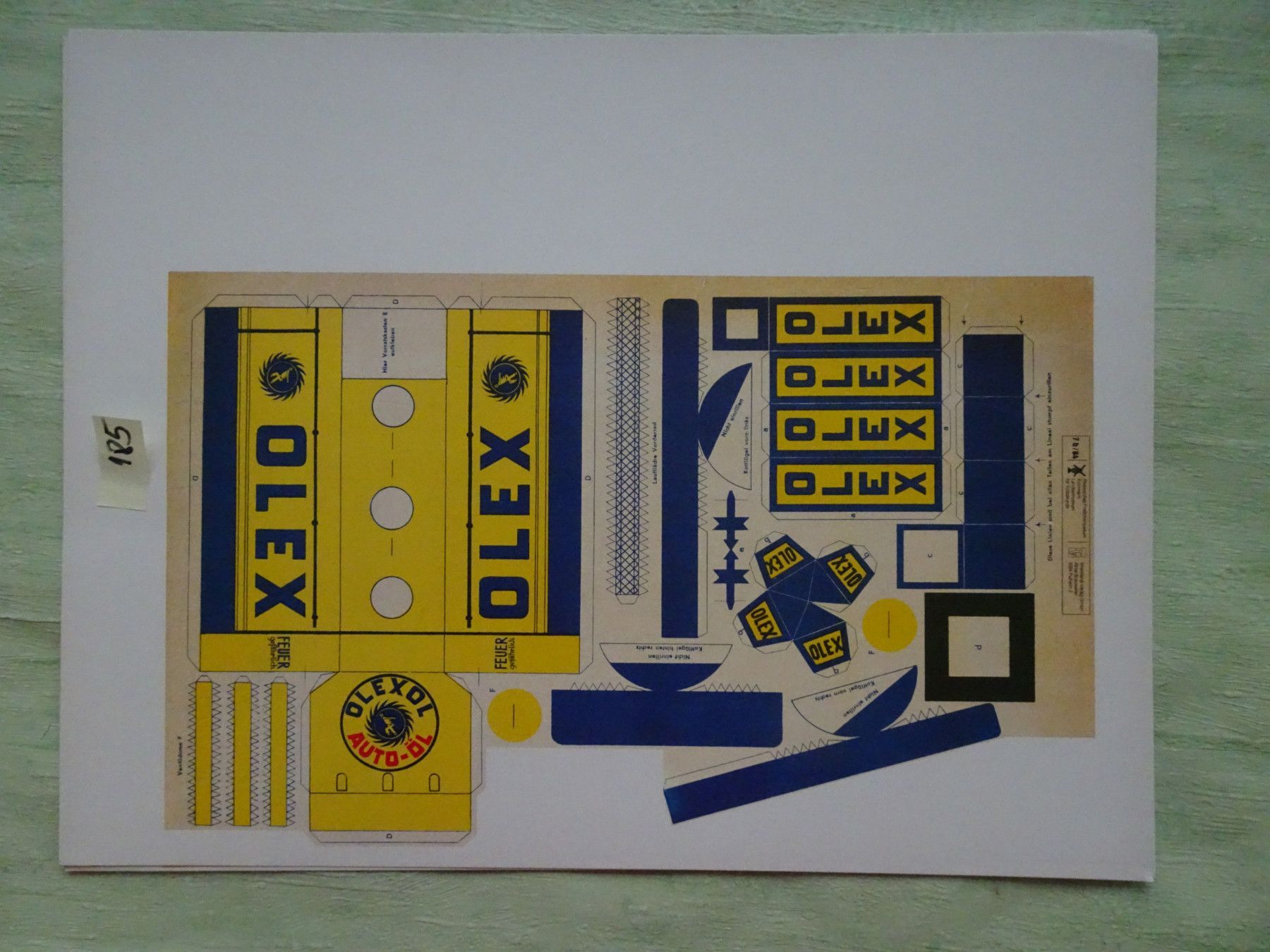 Voici les planches du camion Olex nettoyées. On voit qu'il y a beaucoup à redessiner, mais telle quelle, on peut en tirer un petit modèle. J'ai respecté les indications sur la taille de la feuille blanche et effectivement, le raccord entre la citerne et le châssis paraissent bons. Voici mon tirage sur une feuille A4 de 160 grammes.