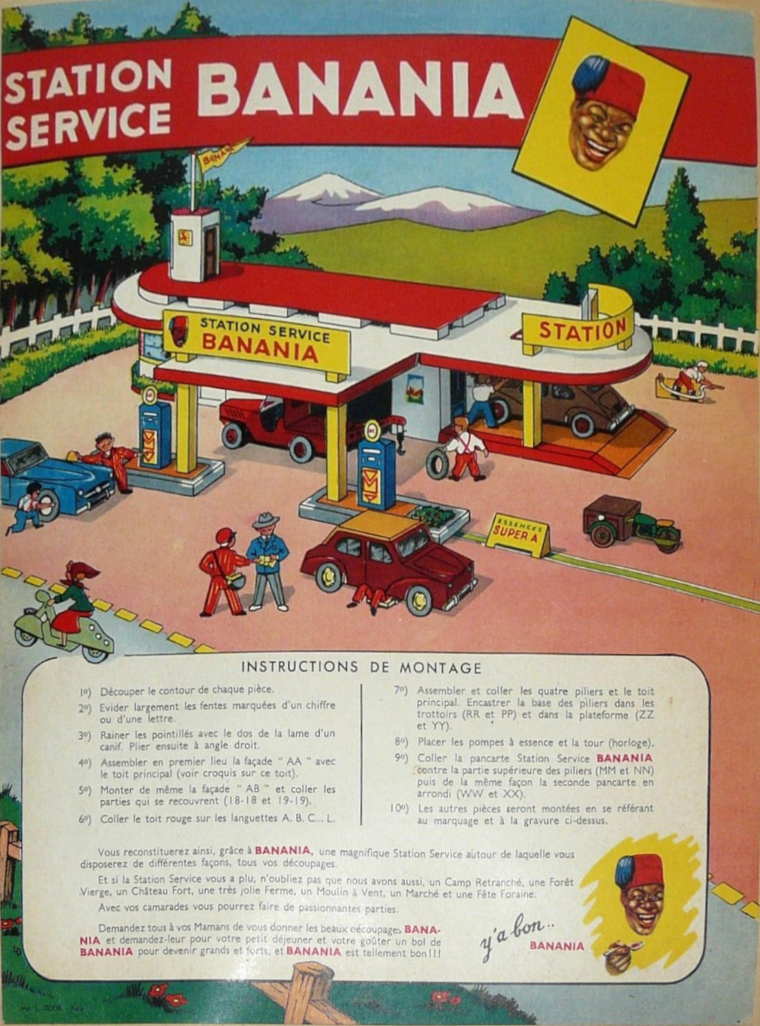 Voici la station service banania nettoyée et redessinée. Les images en jpg ne sont pas extraordinaires, mais je ne sais pas mettre des fichiers en xcf sur le forum, ils sont toujours trop gros, ce qui est normal. J'ai dû réduire à 48 couleurs, puis de 600 à 300 points par pouce et enfin faire une compression jpeg à 85 pour passer en dessous des 2M fatidiques. La définition y perd.