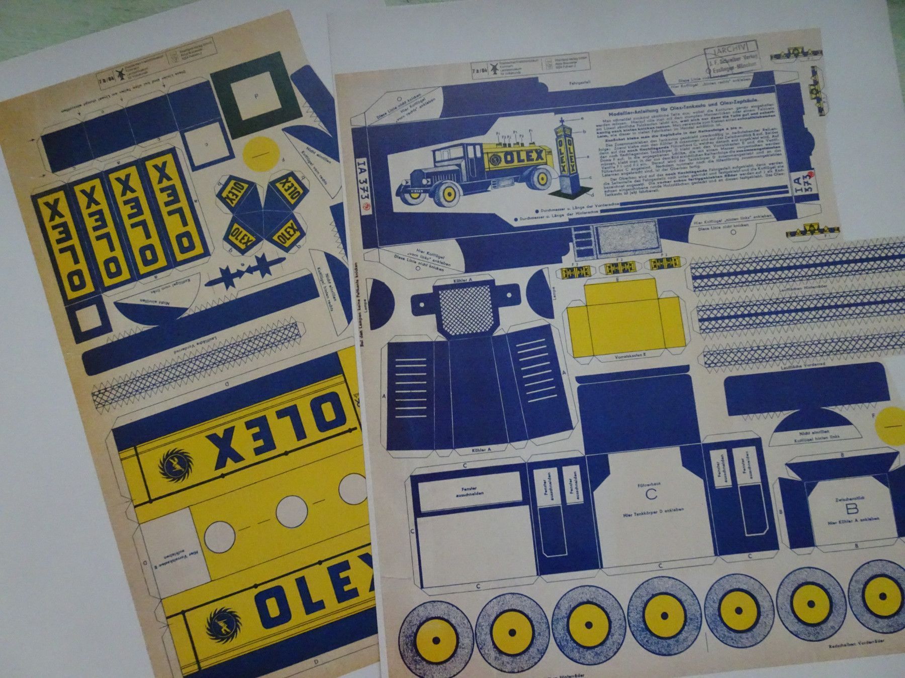 Voici les planches du camion Olex nettoyées. On voit qu'il y a beaucoup à redessiner, mais telle quelle, on peut en tirer un petit modèle. J'ai respecté les indications sur la taille de la feuille blanche et effectivement, le raccord entre la citerne et le châssis paraissent bons. Voici mon tirage sur une feuille A4 de 160 grammes.