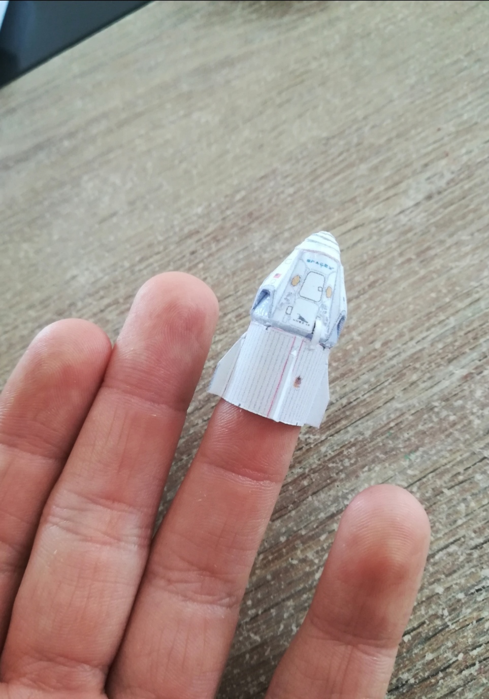 Bonjour, je complète mon album avec la fusée du vol habité qui a été lancée le 30 mai 2020. Voici la falcon 9 avec la capsule crew dragon. Elle faut 26cm (qui est déjà un beau modèle), mais je l'ai réduite sinon elle devait faire 65cm (Jan kytop l'a fait mais sans la modifier il me semble).