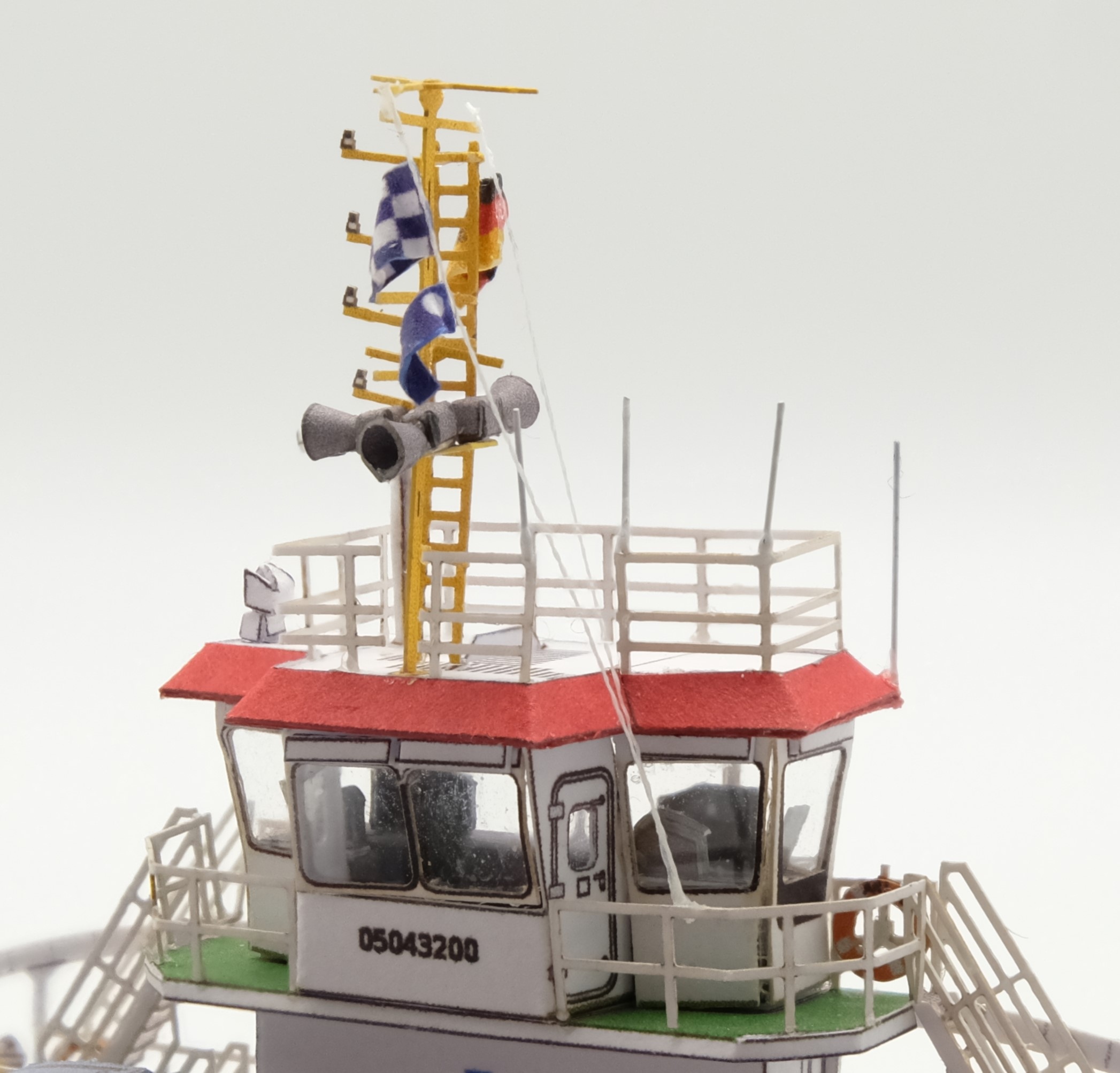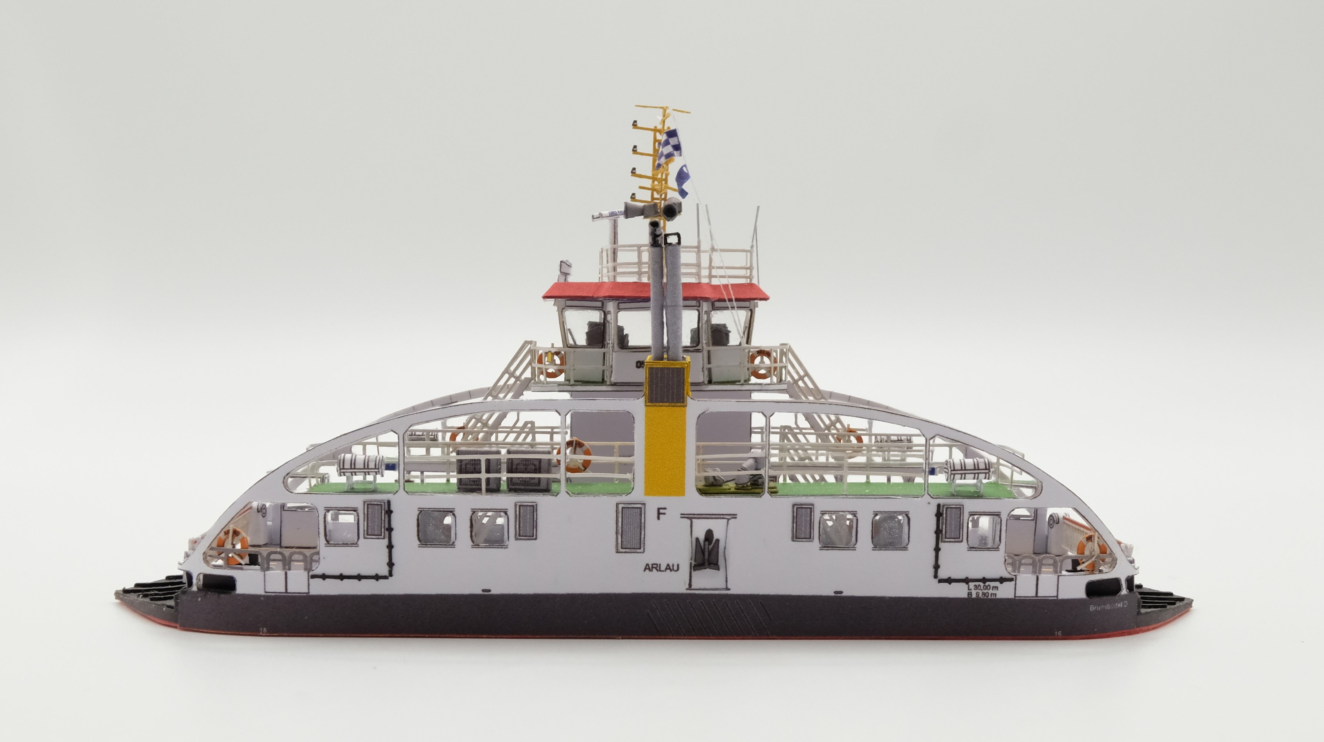 Les 2 feuilles sont imprimées en offset au recto et au verso. Nous avons accordé une très grande importance à la précision d'adaptation à 100% des impressions, de sorte que les lignes de pliage et de coupe des ridelles et autres pièces blanches se trouvent désormais entièrement au verso et ne gênent pas l'aspect du modèle. Pour ce faire, nous avons créé des accessoires découpés au laser qui, pour la première fois, sont imprimés en couleur de manière détaillée et s'intègrent ainsi totalement dans le modèle sans apparaître comme des corps étrangers. Les kits d'accessoires pour ALSTER ou STECKNITZ permettent également de construire ces bateaux à la place de l'ARLAU. Le diorama d'une station de ferry est en préparation. Tous nos modèles peuvent être commandés dans notre boutique à l'adresse www.kmk-verlag.de.