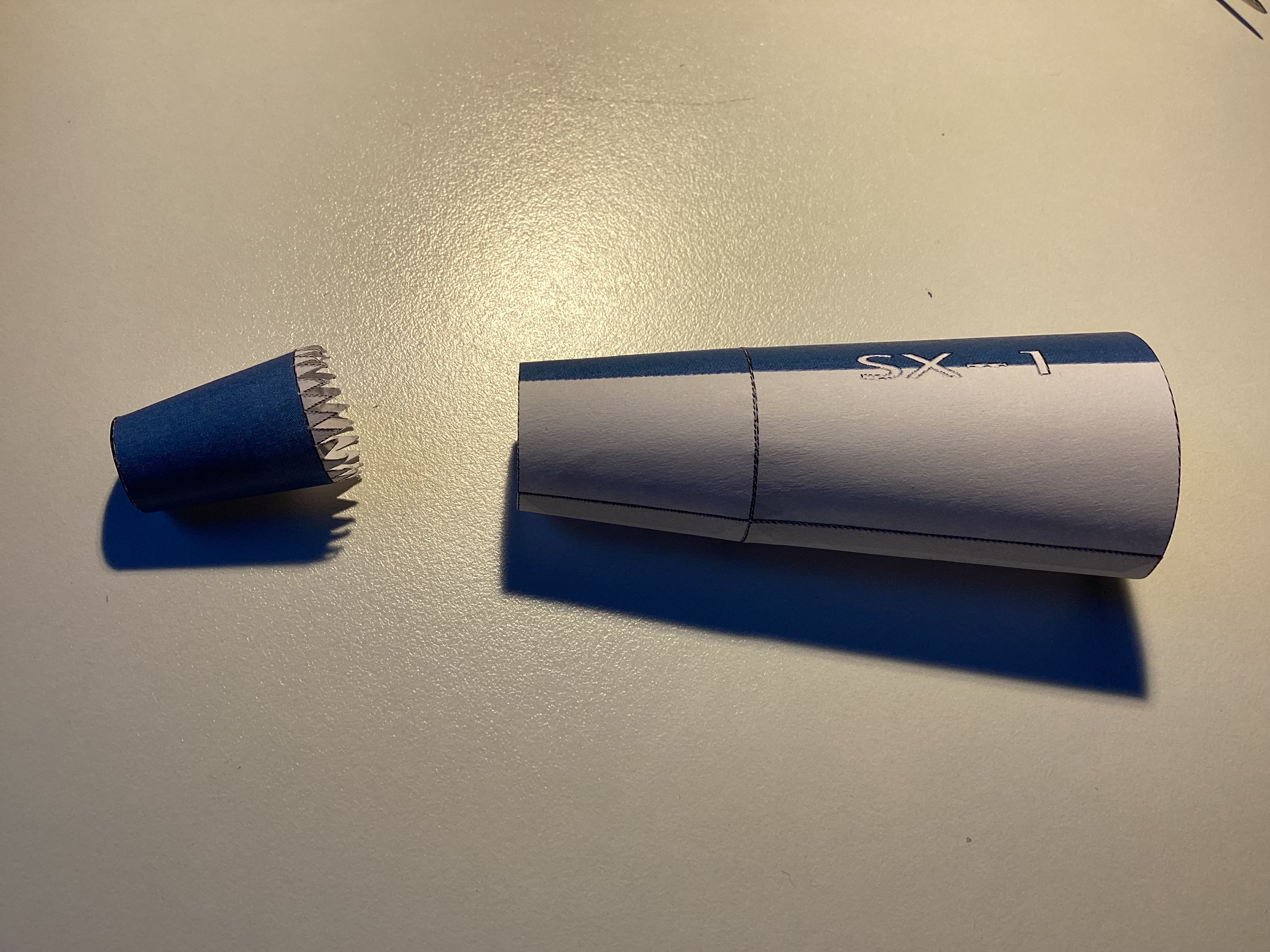 La tuyère du réacteur pour commencer et mise en place. La moitié de stylo sert à garder la forme circulaire de l’arrière lors du collage.