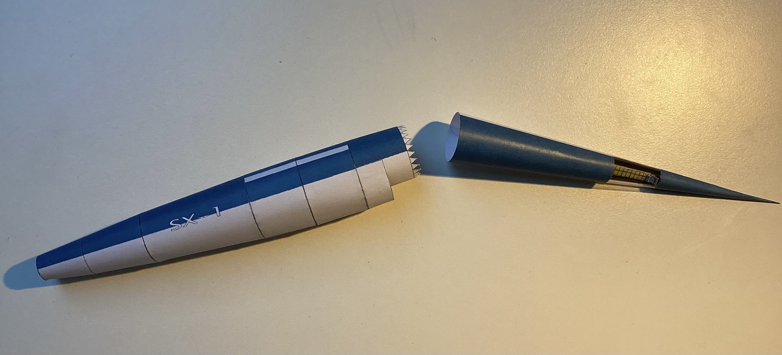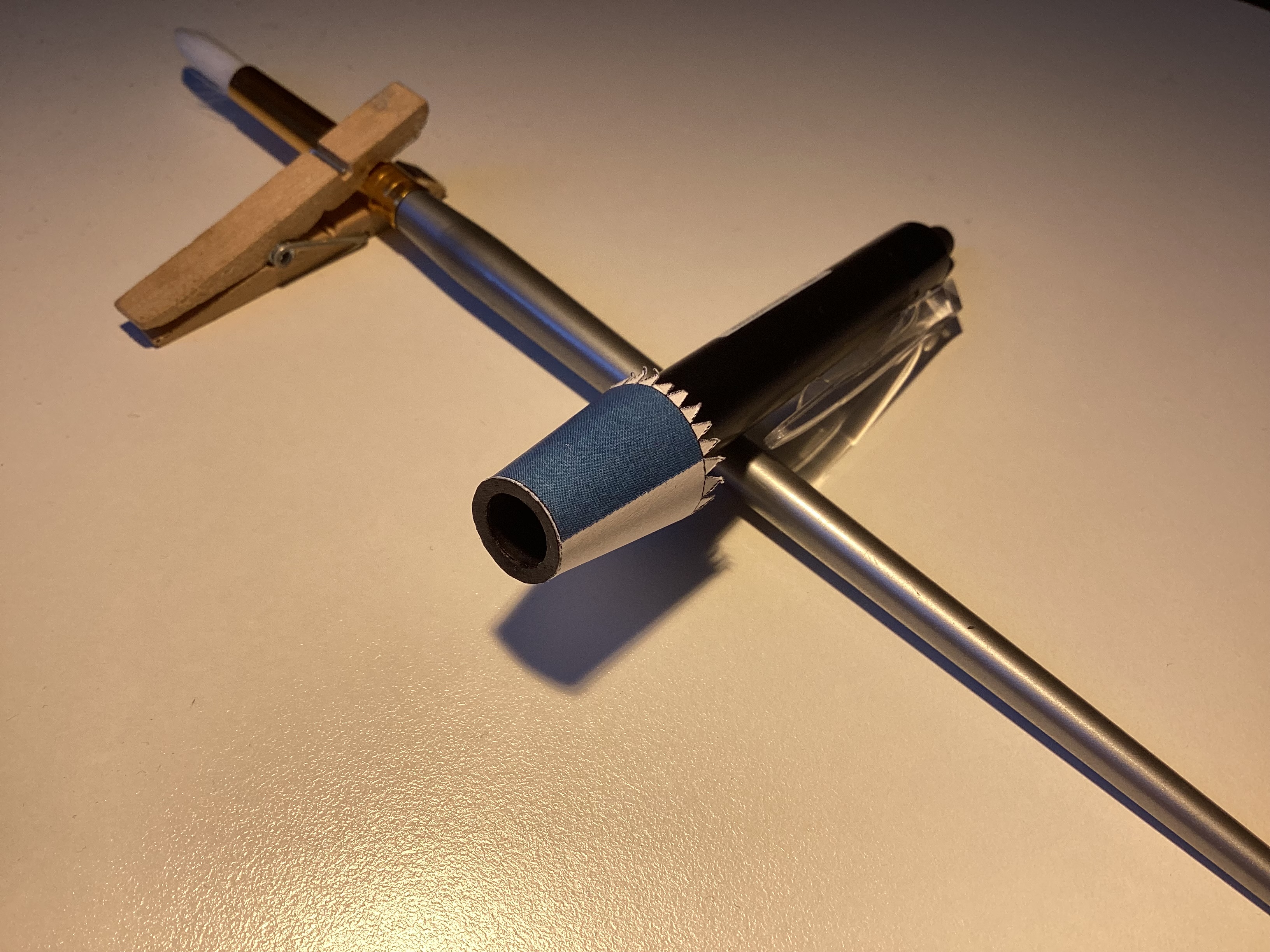 La tuyère du réacteur pour commencer et mise en place. La moitié de stylo sert à garder la forme circulaire de l’arrière lors du collage.