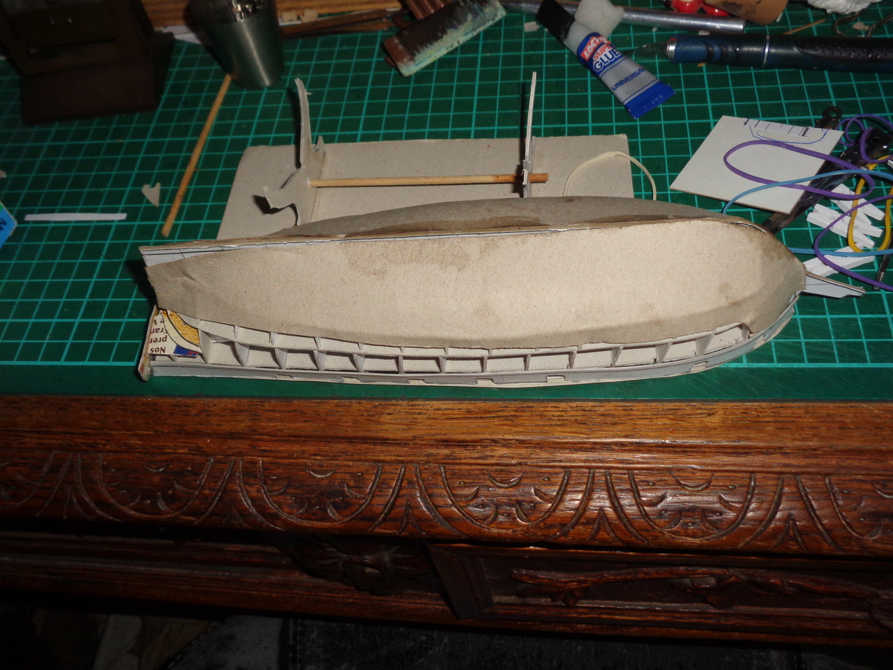 J'ai aussi utilisé pas mal de cyanno, ne serait ce que pour renforcer le carton là où j'ai dû le percer pour faire passer des fils par exemple ou pour coller du métal sur du carton. Parce que, si j'ai remplacé presque tout le bois du modèle par du carton, il y a quand même pas mal de renforts en métal. C'est tout pour ce message