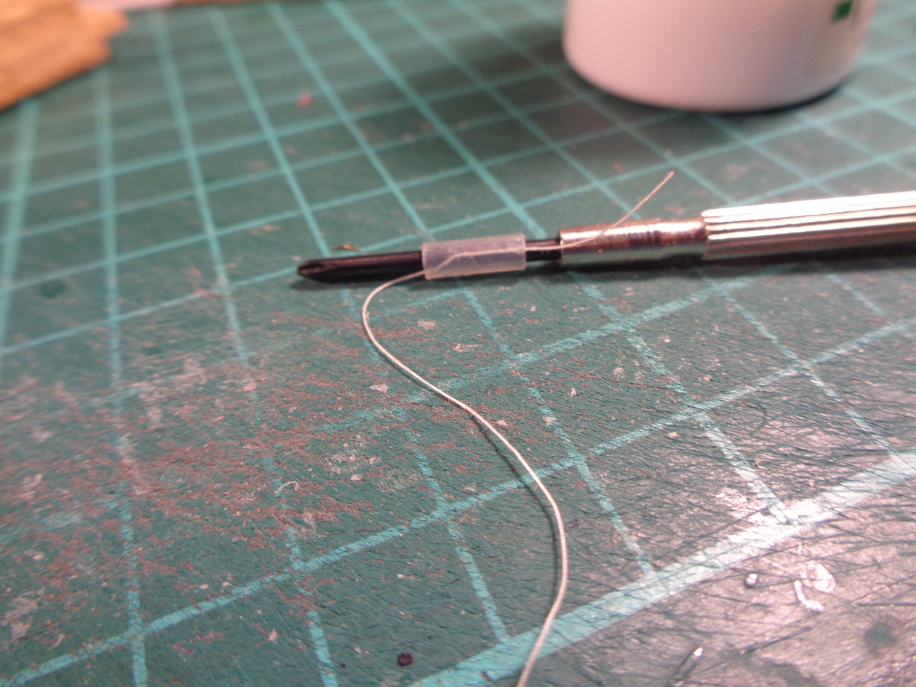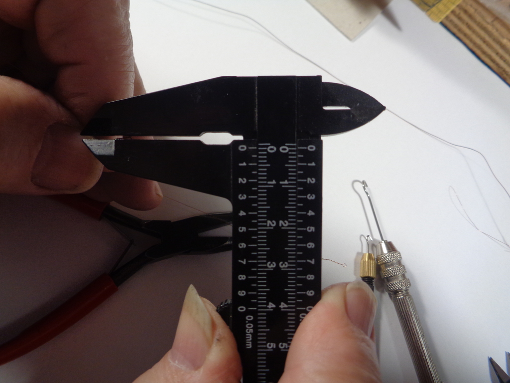 avec du fil plus gros, on fait des fausses poulies un peu plus grosses. Pour les fixer on percera à 0,4 mm, voire 0,5. Voici avec du fil de 0,3 mm puis et et on torsade On voit que la queue torsadée est plus grosse qu'avec le fil précédent