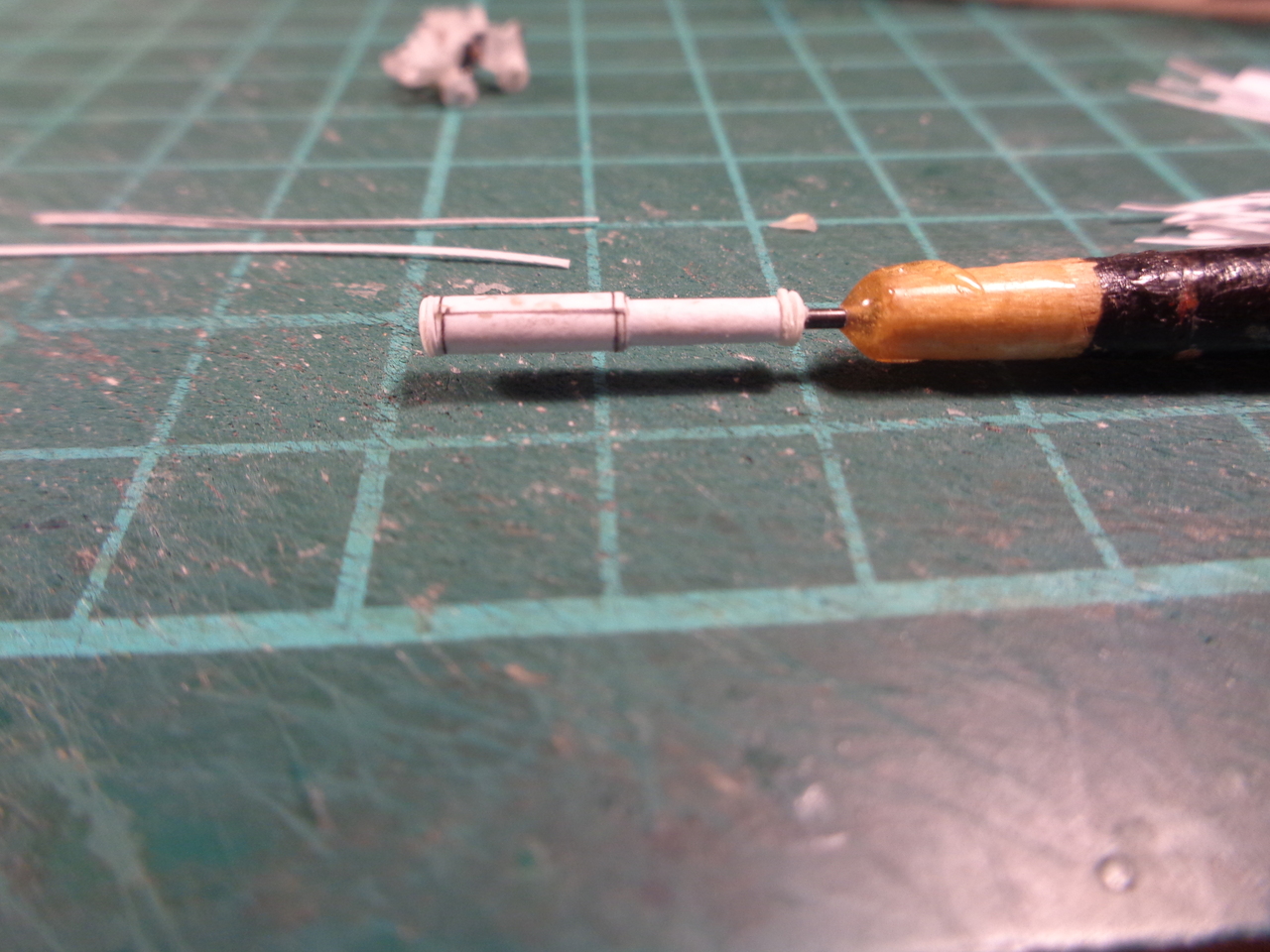 On monte le canon sur un axe . Ici, c'est un foret de 0,8 mm que j'ai collé sur un manche de pinceau (araldite). Et on colle les bandes... On voit qu'elles font moins d'un millimètre. C'est bon pour les nerfs quand on a eu une journée un peu difficile! Les bateaux anciens à petite échelle sont riches en cadeaux de ce genre! On y ajoute un petit anneau en arrière de la culasse qu'on remplira de colle pour simuler le bouton de culasse. Rappelez vous que l'anneau fait moins de 1 mm! Une tête d'épingle pourrait faire l'affaire, mais petite. Puis on le percera transversalement et lui mettra un énorme morceau de fil de fer de 0,6 mm de diamètre environ (dans les 10 cm à l'échelle) qui sera le pivot du canon sur l'affût. Je poncerai un peu avant peinture , mais c'est si petit que ce n'est pas vraiment nécessaire. il suffit de mettre la ligne de joint dessous!
