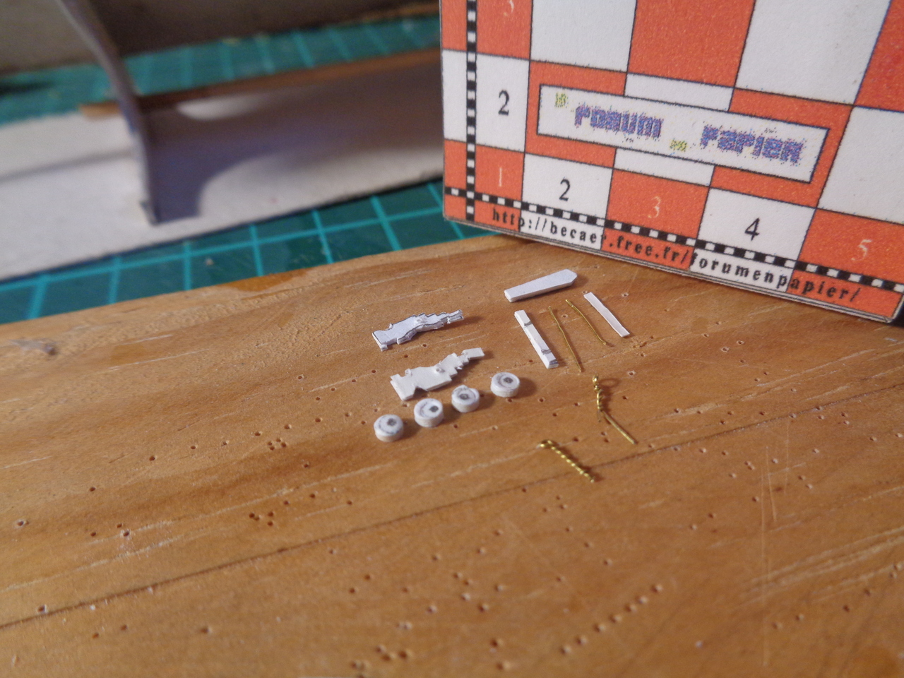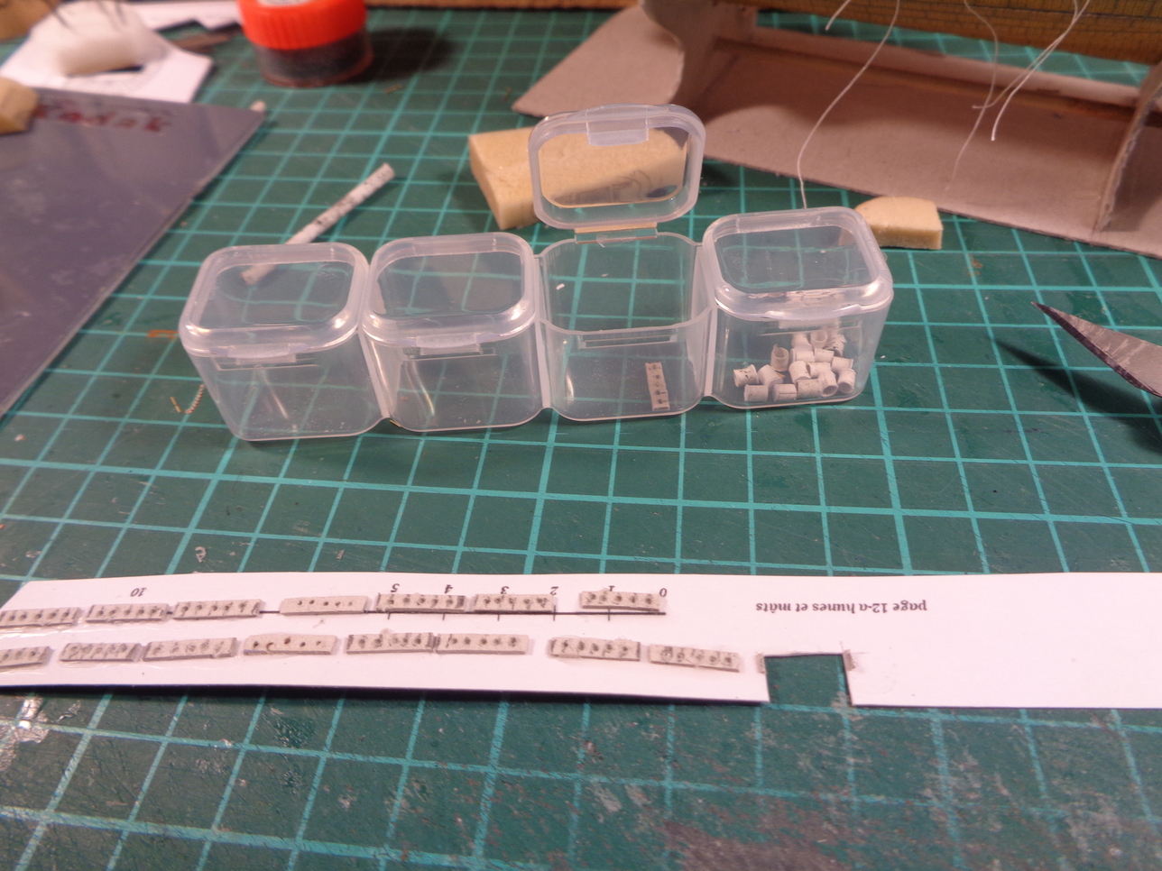 Les voici avec leurs fausses charnières. Il en faut 16, deux fermeront les deux sabords avant qui n'auront pas de canon.J'en ai fait 17 au cas où j'en perdrais un.... Je fais sans arrêt tomber les pièces sur lesquelles je travaille. Heureusement que je ne fais que peu de modèles en plastique. Le papier ne craint pas grand chose....
