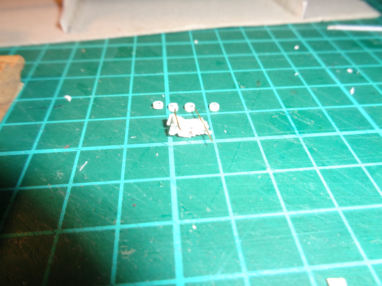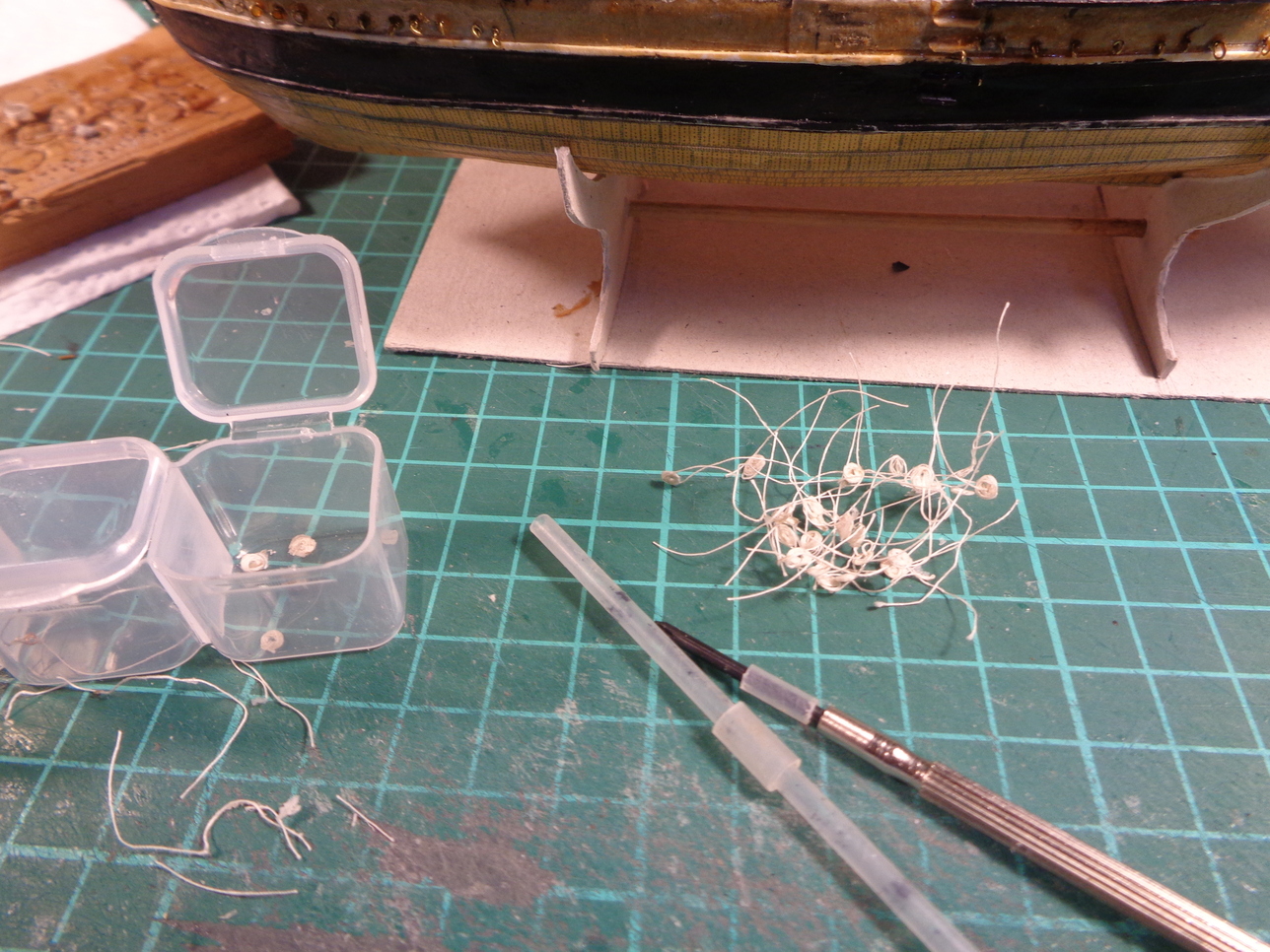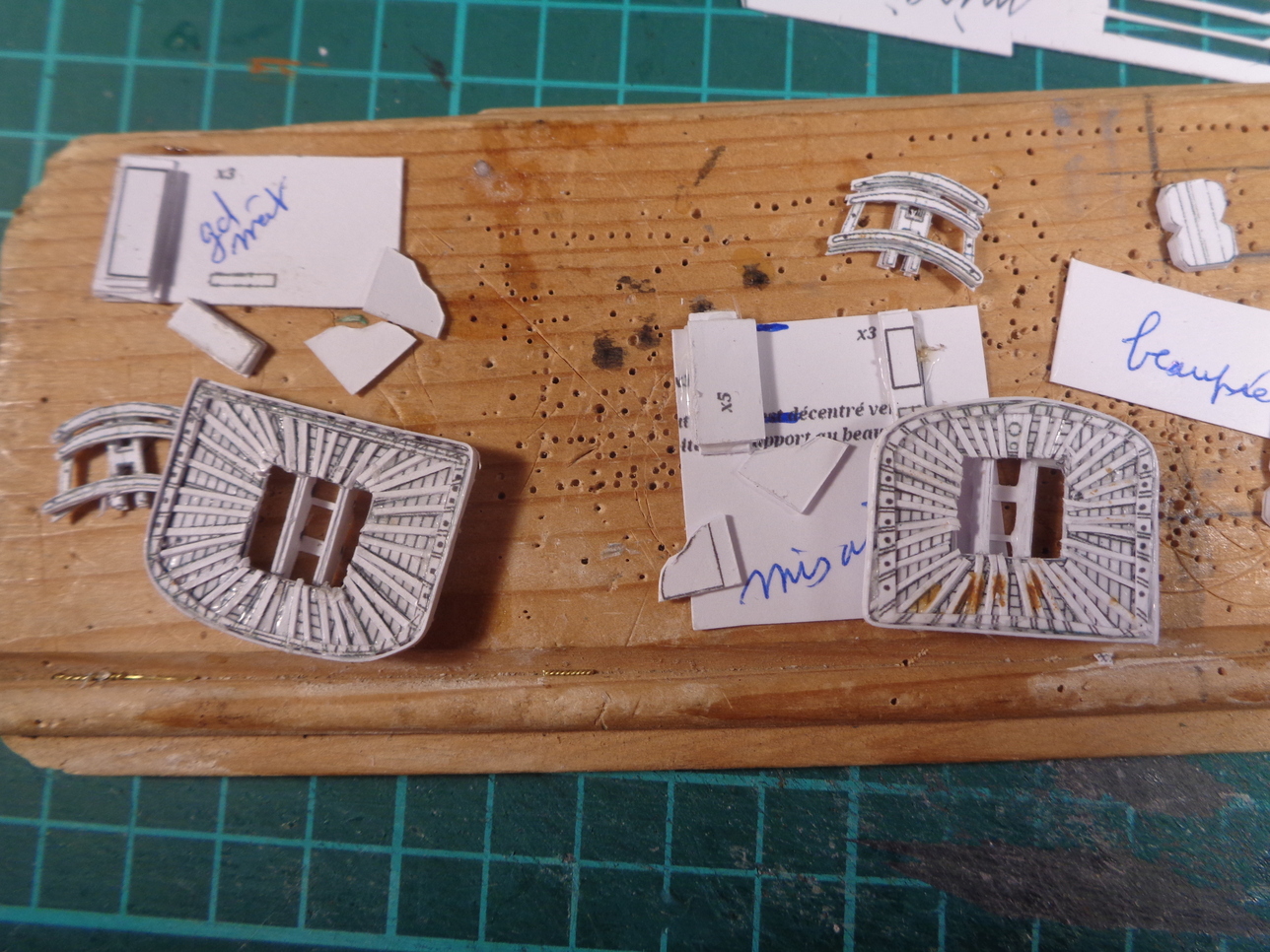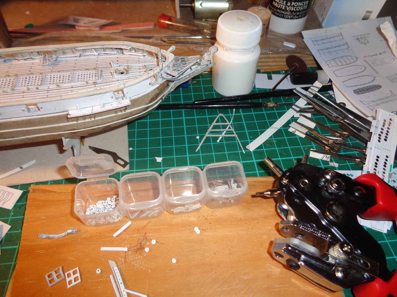 Les seaux ne sont qu'un morceau de tube en papier découpé en petites pièces de 3 mm de haut ou un peu moins, et collés sur une plaque qu'on découpera ensuite. En mouillant le papier et avec une petite matrice, ou doit pouvoir les évaser facilement. Pas de bol, les seaux près des canons étaient évasés à l'envers. Le vase que la cigogne a proposé au renard par exemple. J'ai fait tubulaire. À plus grande échelle, ça valait le coup, mais pas au 1/142 ème. En plus, c'est à un endroit peu visible. Les parcs à boulets sont quelques épaisseurs de carton , percées à moitié à 0,4 ou 0,5 mm , cinq par cinq, qu'on peint en bois moyen comme les seaux. Dans les trous, je colle des petits plombs de pêche qui sont presque du diamètre de l'embouchure du canon. On doit trouver le mêmes sans fente pour un prix modique pour la chasse. les voici près d'un canon, avant peinture des fausses poulies et roulage des cordages Actuellement, je viens de coller les trois bas mâts, j'ai ajouté des tas de détails , commencé à monter des caps de moutons, que je trouve trop gros, mais je n'ai pas su faire bien plus petit. Ils font entre 2 et 3,5 mm. D'un seul coup, on voit comme la coque semble frêle et minuscule face à l'immensité relative des mâts et de la surface des voiles qu'ils soutiennent.... Le beaupré est un monument de finesse élancée. Rien à voir avec les patauds vaisseaux du XVI ème et du XVII ème. Le bateau n'a plus besoin de décorations et de couleurs pour être beau, il a la beauté de la perfection de sa réalisation pour sa fonction. Rationalité complète par rapport à l'état de l'art de son époque, fin de la marine en bois et quelques années plus tard les clippers semi métalliques fendront les mers, et, l'acier et la machine à vapeur feront naviguer des monstres métalliques aux allures de dinosaures dans des nuages de fumée nauséabonde..... Avec des canons toujours plus gros!