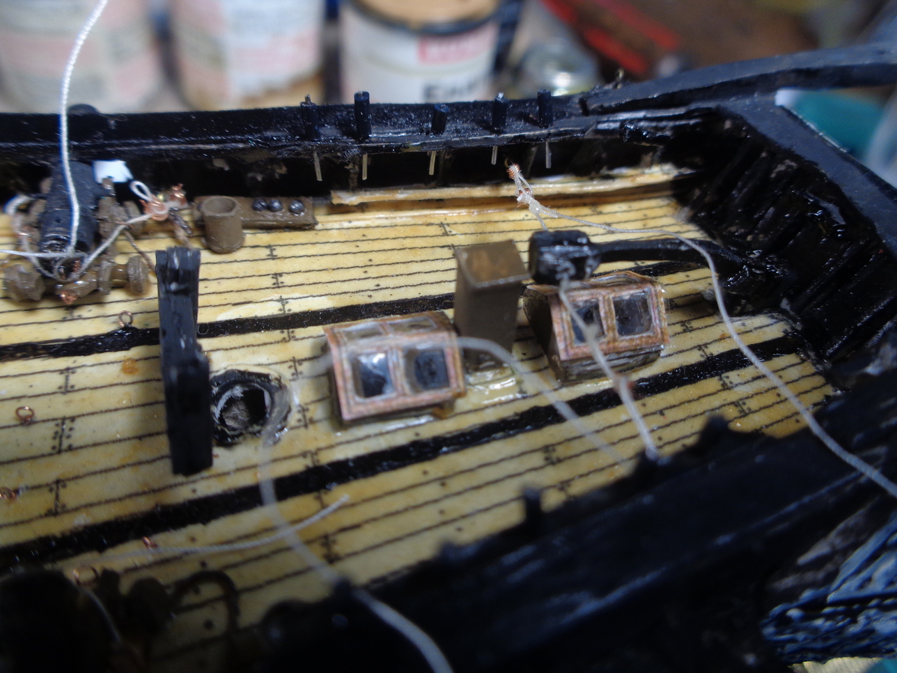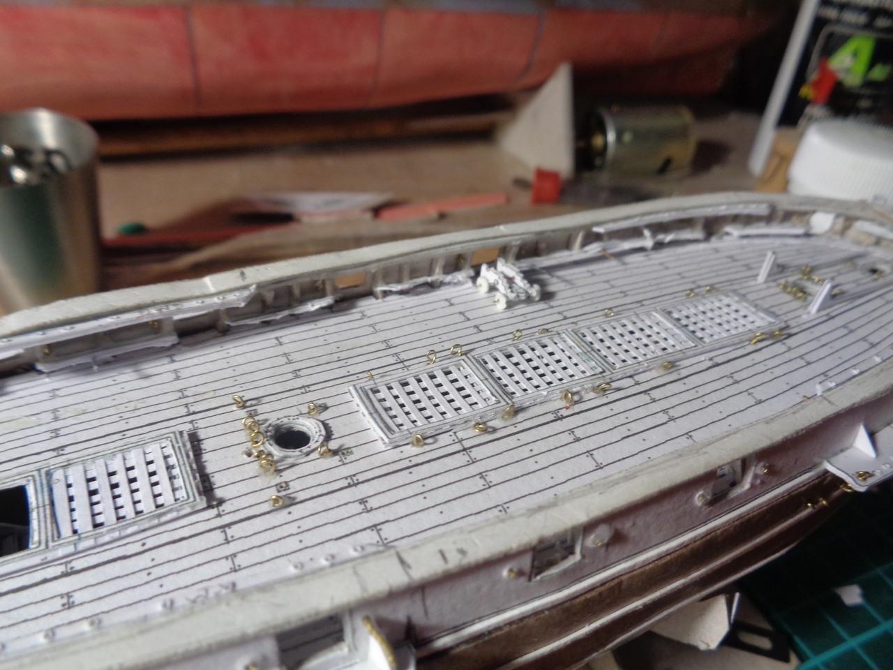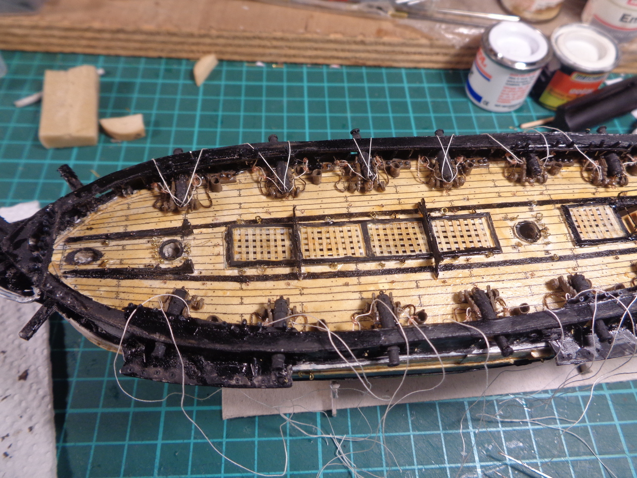 Et voici le pont de dessus avec les canons bien en place, les bragues et les palans fixés à travers la coque et les "manches " des anneaux qui dépassaient du pavois coupés à ras. Les fils des palans passent dans les petits anneaux latéraux des affûts, puis autour du bouton de culasse, puis seront enroulés sur le sol. Mais avant ça, il va falloir disposer les bragues. On voit bien la différence de l'avant, déplacement des bossoirs, des sabords et des porte haubans. Ceux ci seront un peu allongés plus tard. Les cabillots sont faits d'un petit morceau de fil à "wrapper" de 0,2 mm de diamètre à peu près en gardant l'isolant pour simuler la poignée. C'est plus vite fait que dit! Mais qui sait encore ce qu’était du wrapping? Un emballage de Cristo peut être? Non, c'est ça Les picots sont à 2,54 mm les uns des autres.