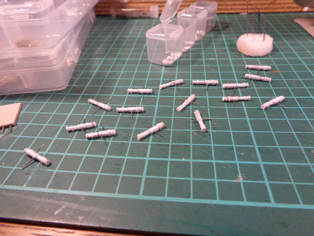 voici les choses qu'on fabrique avec l'outil du message précédent: Il y a un deuxième outil pour faire des rouleaux plus gros. On enroule une dizaine de spires autour de l'axe, on mouille avec de la colle à bois, on laisse prendre quelques secondes et on sort le petit rouleau en poussant sur le petit morceau de tube. Le cordage sort de l'axe. Pour les canons, on l'écrase avec une pince plate pour faire une galette dont on coupera les bouts qui dépassent. On colle la galette près du canon (une de chaque côté) et on colle le fil qui vient des palans vers le centre de la galette. Et ça fait comme sur les vrais bateaux et personne ne pourra les déranger et énerver le capitaine....On voit trois petites galettes dans le casier à gauche. Des cordages juste sortis du moule sont en tas à droite.Il vaut mieux les écraser avant que la colle ne soit sèche.