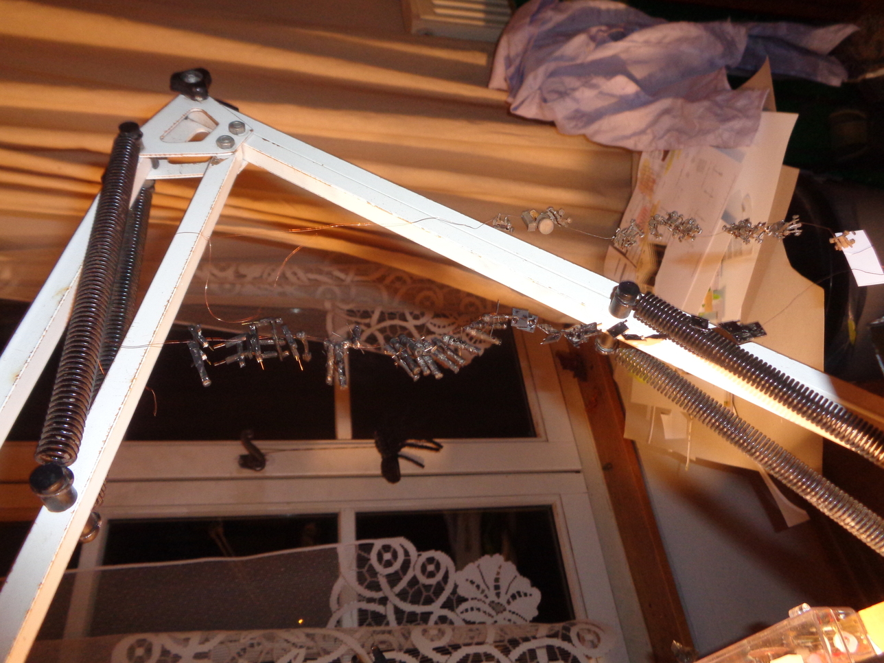 J'ai commencé par essayer de faire une des rampes avec le filet de sauvegarde. La photo n’est pas bien bonne, mais voici la première. Deux bandes très fines de carton, percées à 0,3 mm avec des fils de laiton du même acabit dans les trous.Ça paraît tout de travers mais une fois remis en forme et les longueurs inutiles coupées, ce sera très bien.