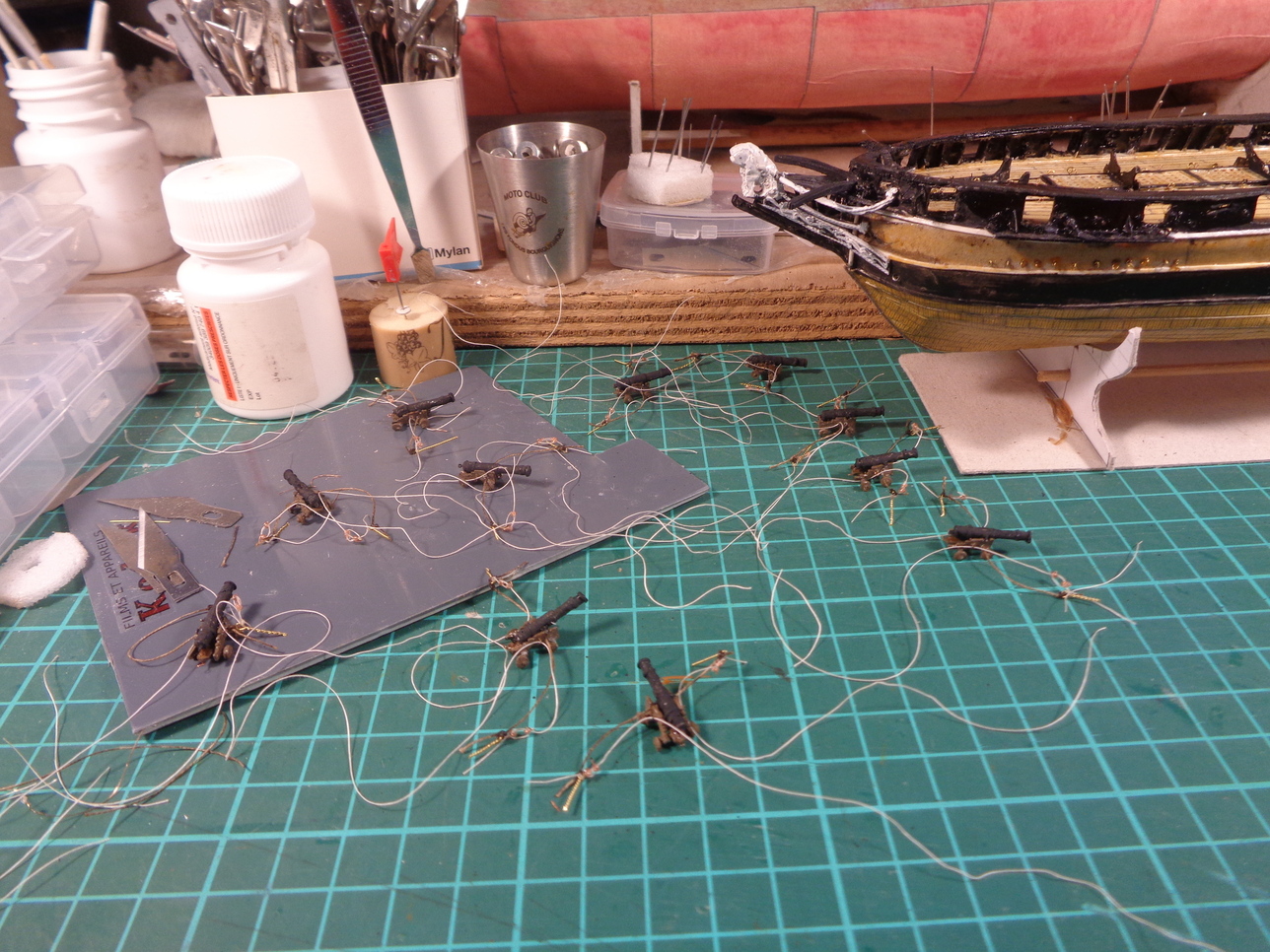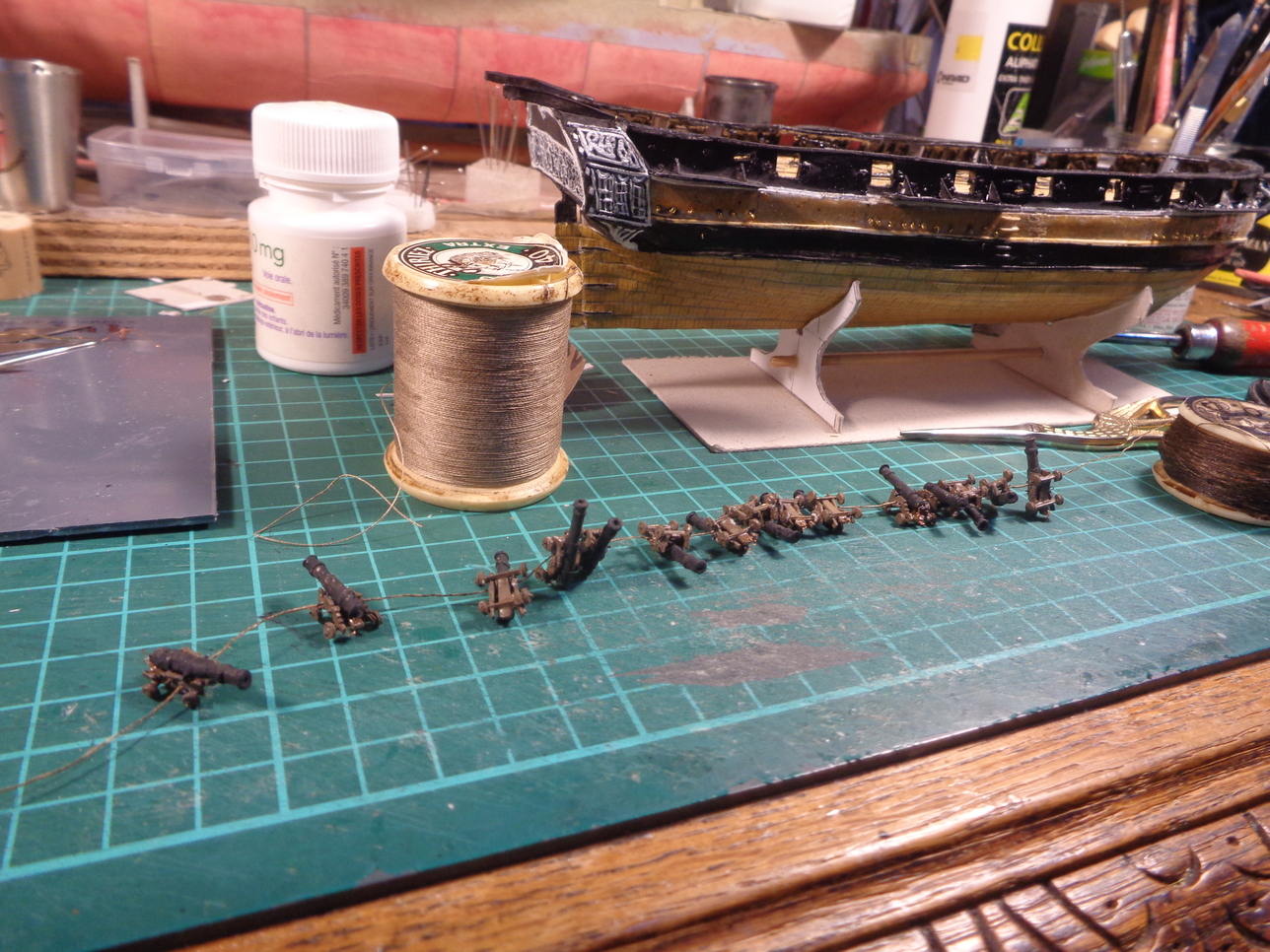 Sur les affûts français, la brague passait à travers des trous, sous le canon et était fixée su le pavois. Canons sortis, la brague n'est jamais tendue. Elle est là pour limiter le recul après le tir... Pour la passer à travers le canon j'ai trouvé plus simple de les enfiler tous sur un câble de la bonne taille et de couper ensuite au besoin pour le montage. Les fils que j'utilise sont teintés au brou de noix plus ou moins dilué pour les cordages foncés et au thé pour les clairs. . Et de temps en temps, j'en torsade un peu pour des cas exceptionnels comme les étais. Test de montage Je trouve que c'est très réaliste. Dans le prochain message on verra comment installer les canons.