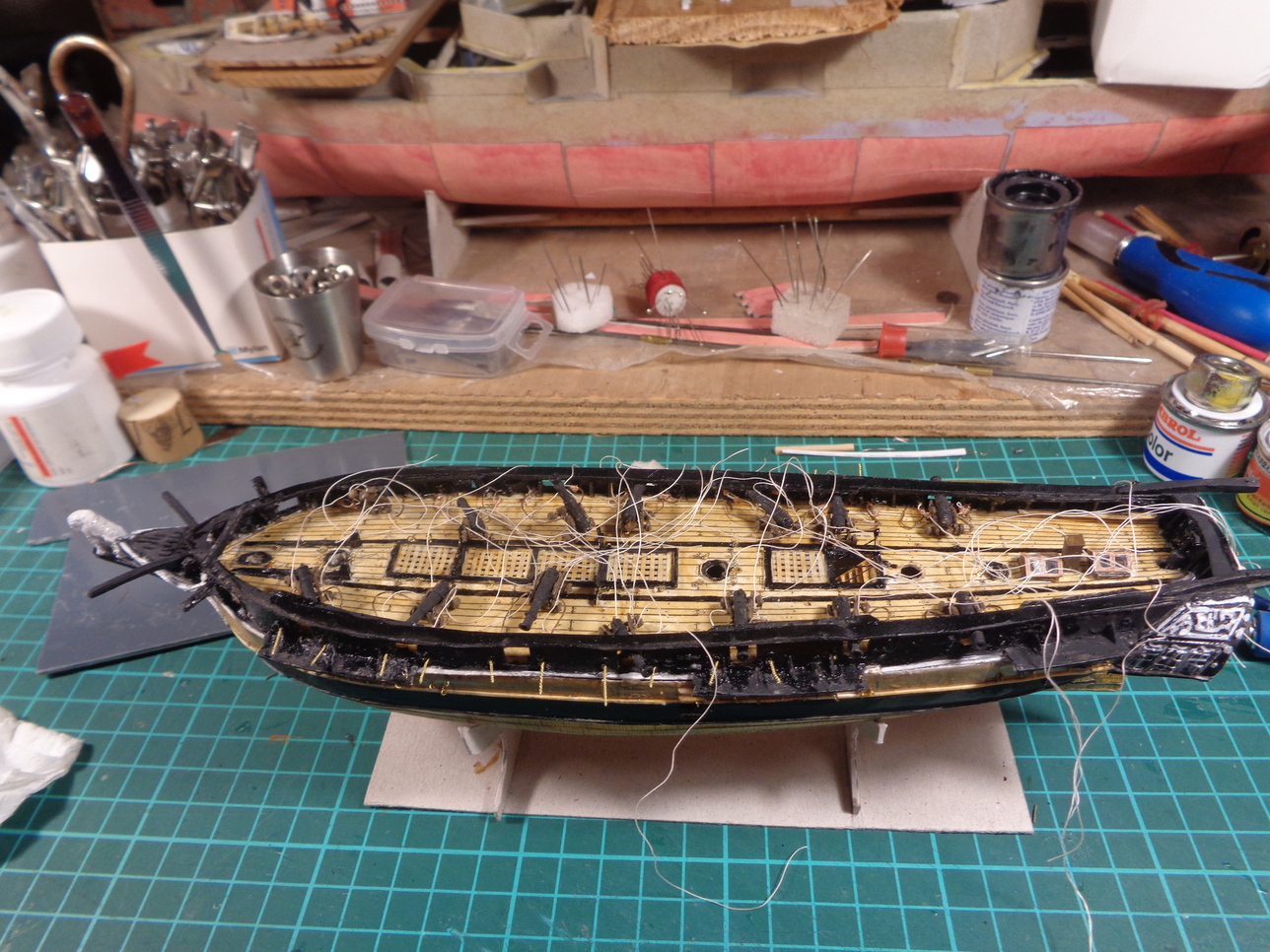 Toujours sur les canons! Voici la coque vue de devant. Notez que la position des bossoirs a été reprise Le dessin du début était déjà modifié et est correct. Les canons sont à leur emplacement. C'est là que j'ai vu qu'il était impossible qu'il y ait seize canons de ce type sur la coque. On se demande s'ils n'ont pas été ajoutés par quelqu’un d'autre que le modéliste d'origine sur le modèle du musée de la marine. Au fit, les deux bandes noires qui traversent tout le pont en longueur ont été peintes au pinceau à main levée. On voit aussi une série de cabillots noirs .