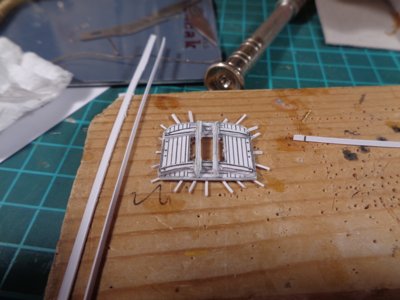 Voici la hune avec les petites barres coupées et un tour ajouté. C'est une bande de un millimètre de large environ. Il y aura d'autres renforts à ajouter.