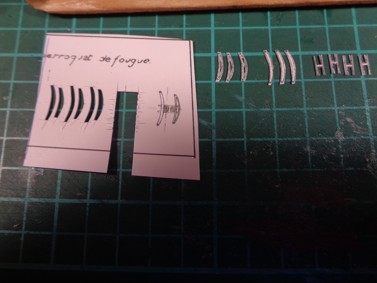 Voici un petit marin près d'une hune en construction. Elle était aussi grande qu'une chambre d'appartement de maintenant, et pourtant, la Lionne était un tout petit navire de moins de 400 tonneaux! La découpe de la planche. Vous voyez qu'elle est très différente de celle que je viens de vous donner. C'est du 220g. J'ai séparé chaque sous élément pour ne pas avoir trop de choses à la fois sur ce qu'il reste de mon bureau. J'ai également découpé un "certain nombre" de bandes fines (environ 0,5 mm) du même carton avec une lame de cutter neuve. Les hunes sont pleines de petites barres qu'il est joli de représenter. Tout le monde croit que c'est du bois! Il est très difficile de faire des barres longues aussi fines, aussi je me limite à une quinzaine de centimètres et j'en fais une vingtaine à la suite.