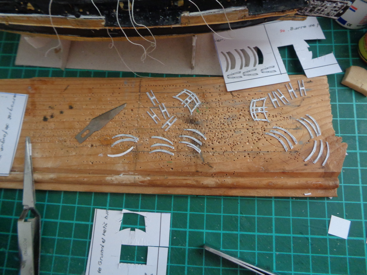 Je mets toujours des grands morceaux de matière inutiles que je coupe ensuite. Sinon, je n'arrive pas à manipuler les objets! Pour le filet, j'ai utilisé un petit morceau de blindage de câble plat utilisé en électronique pour protéger les petits signaux des parasites avant l’avènement de la fibre optique de masse et du blue tooth. Plus les trous sont fins plus la plage des fréquences qu'on supprimait était élevée et c'était moins cher que du blindage plein.... Ça fait mon bonheur pour le modélisme. On peut utiliser d'autres choses ou même le tisser soi même avec des fils très fins, métalliques ou textiles. On verra ça bientôt.; Attention, les barrières ne sont pas identiques, même hauteur mais largeur en fonction de la hune et pas toujours le même nombre de "piliers"!