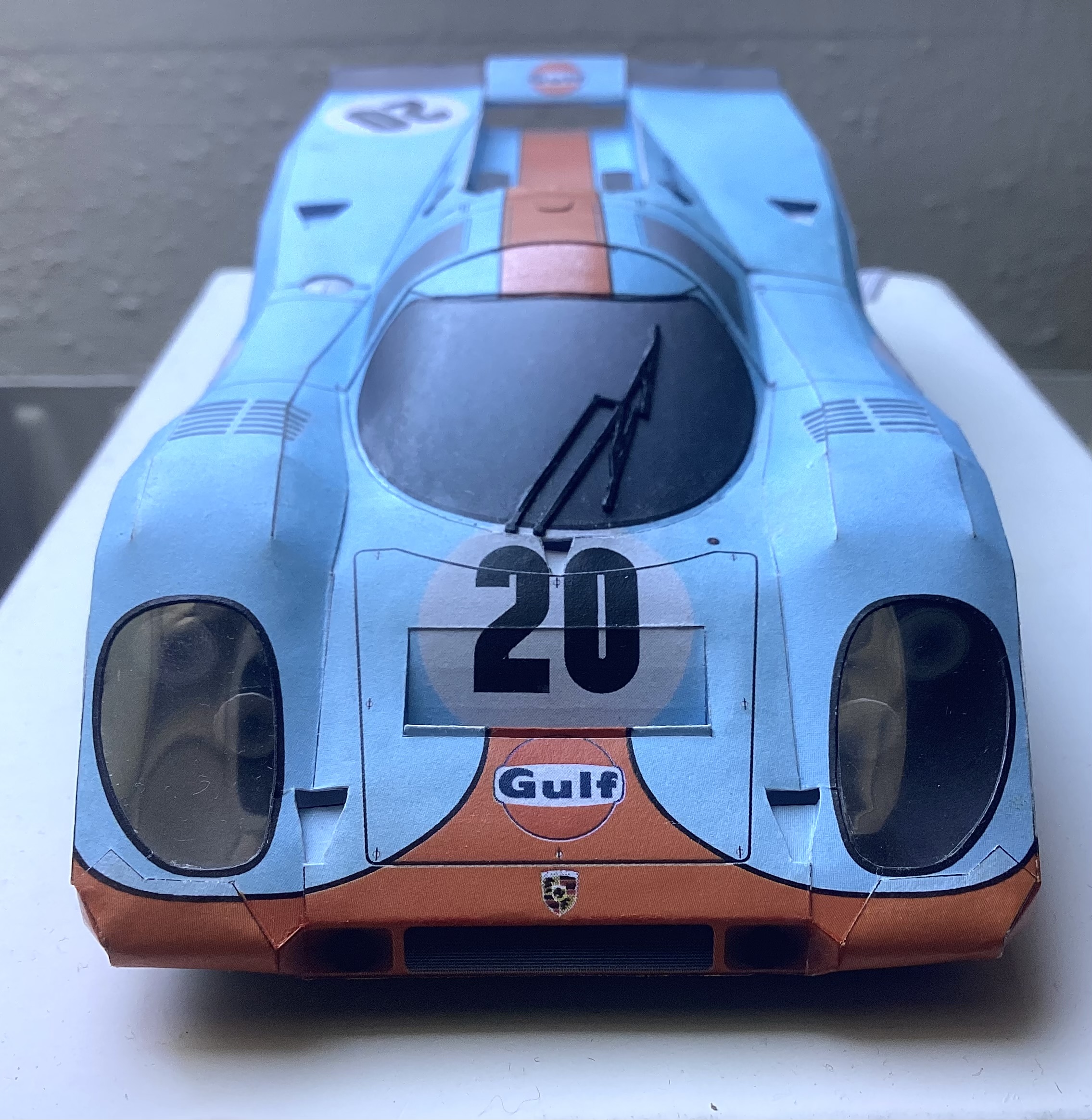 Porsche 917K de 1970, ech. 1/24. La livrée est celle de la voiture de Steve McQueen dans le film « Le Mans » (1971). La maquette provient de papersportscars.wz.cz.