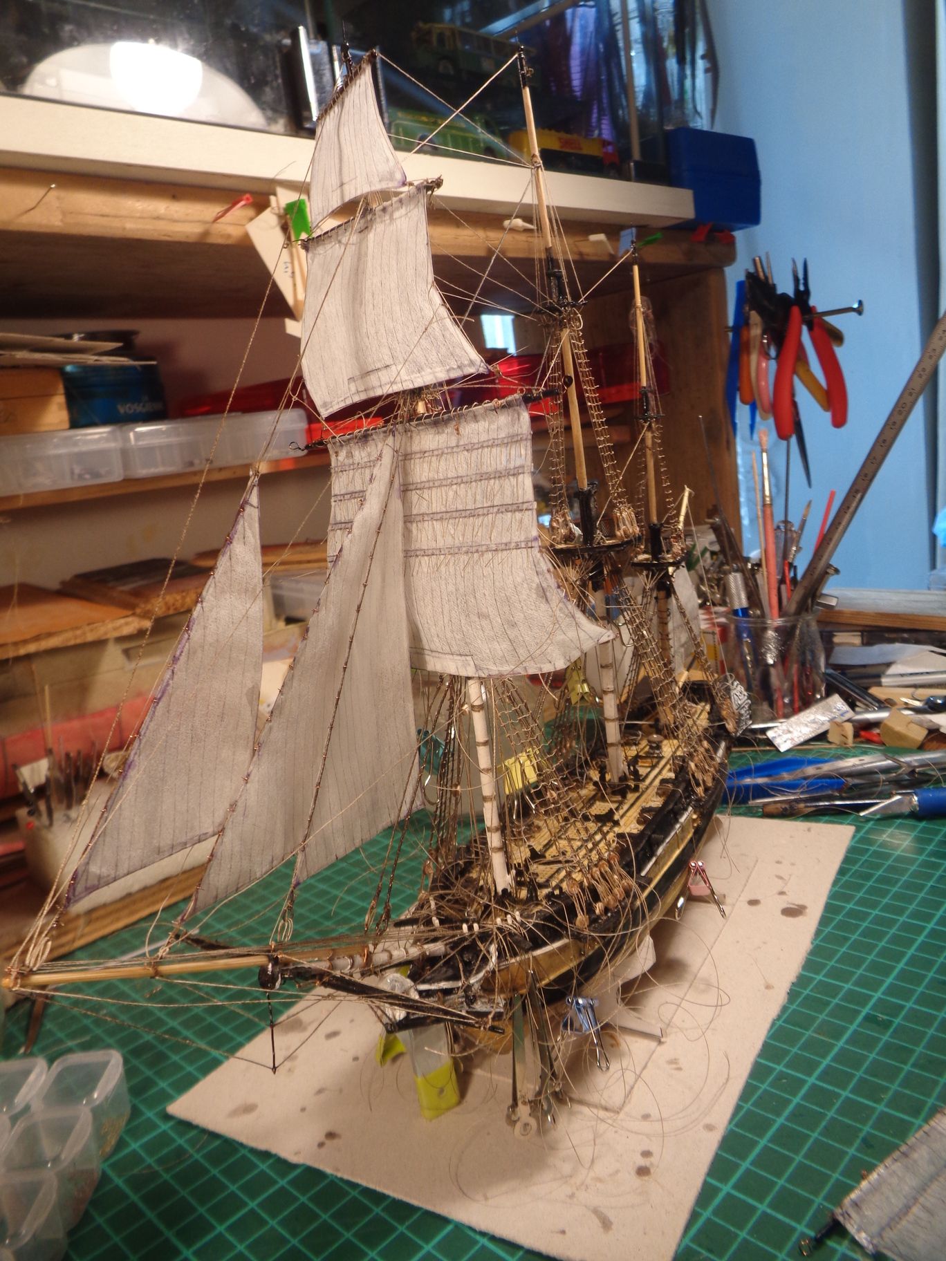voici où j'en suis. Demain, je devrais faire un peu de propre autour de la chose et peut être commencer avec les voiles carrées. La première sera le cacatois de misaine!