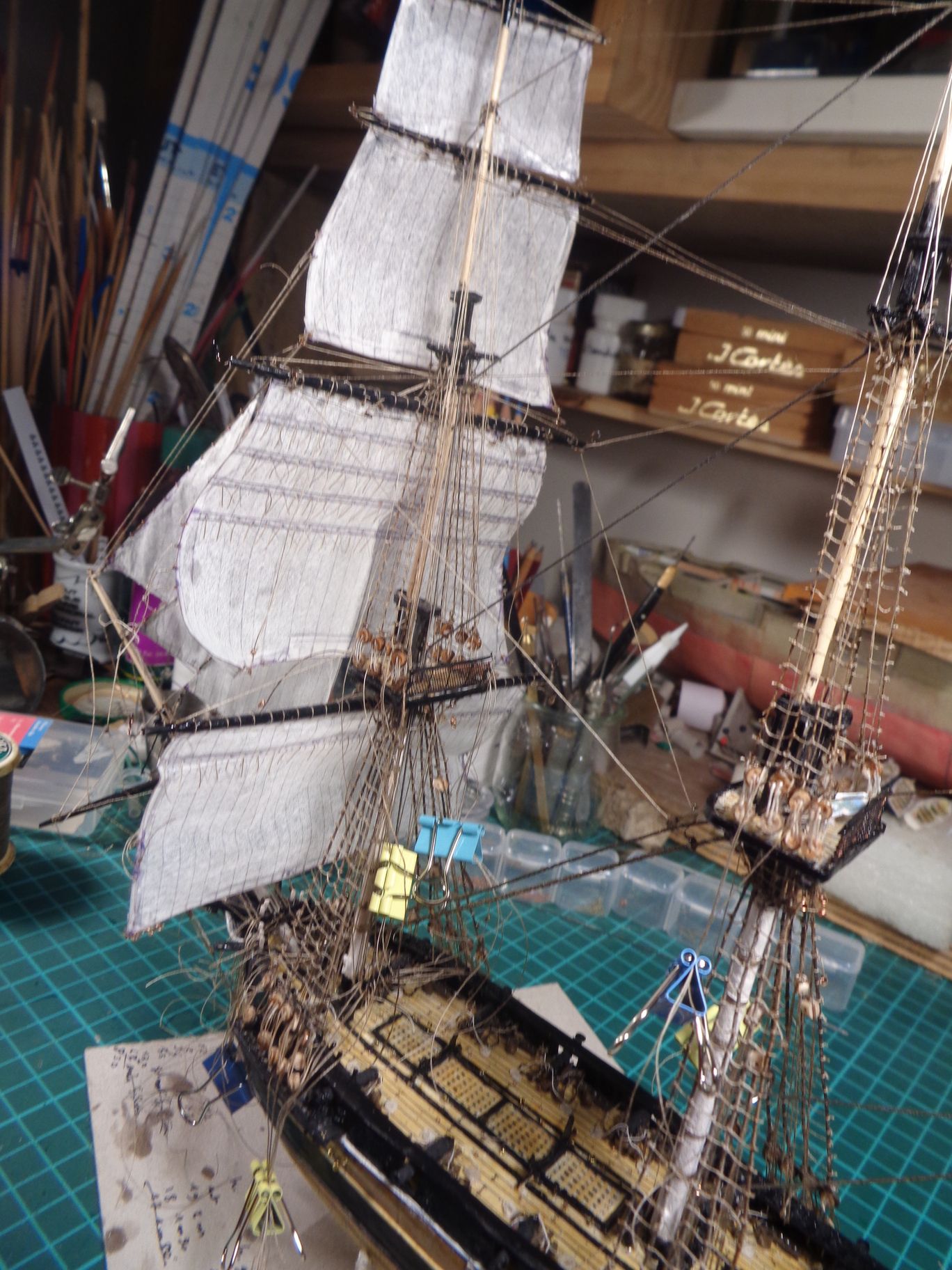 Voici où j'en suis. Demain, je complète le gréement du petit perroquet, et j'espère préparer le petit hunier et la fixer sur sa vergue. Elle et la grande voile de misaine ont un gréement bien plus complexe à cause de leur taille et de leur poids. Bonne soirée à toutes et à tous!